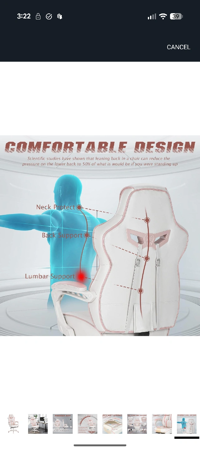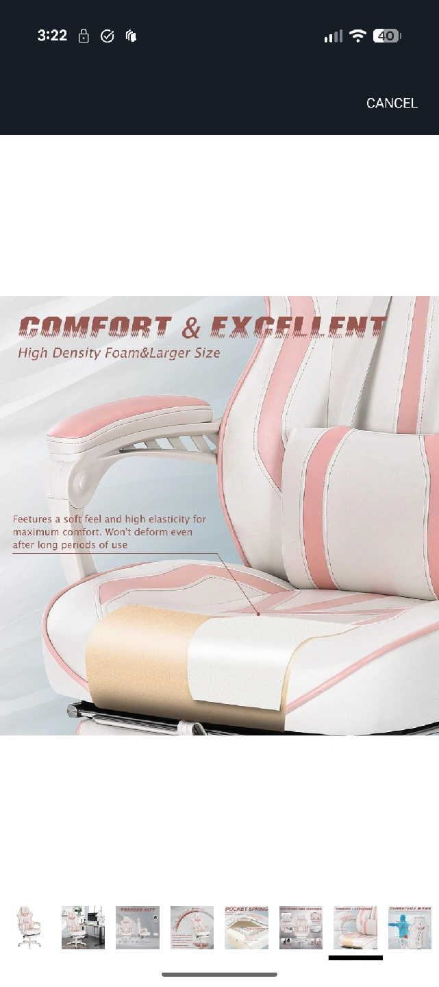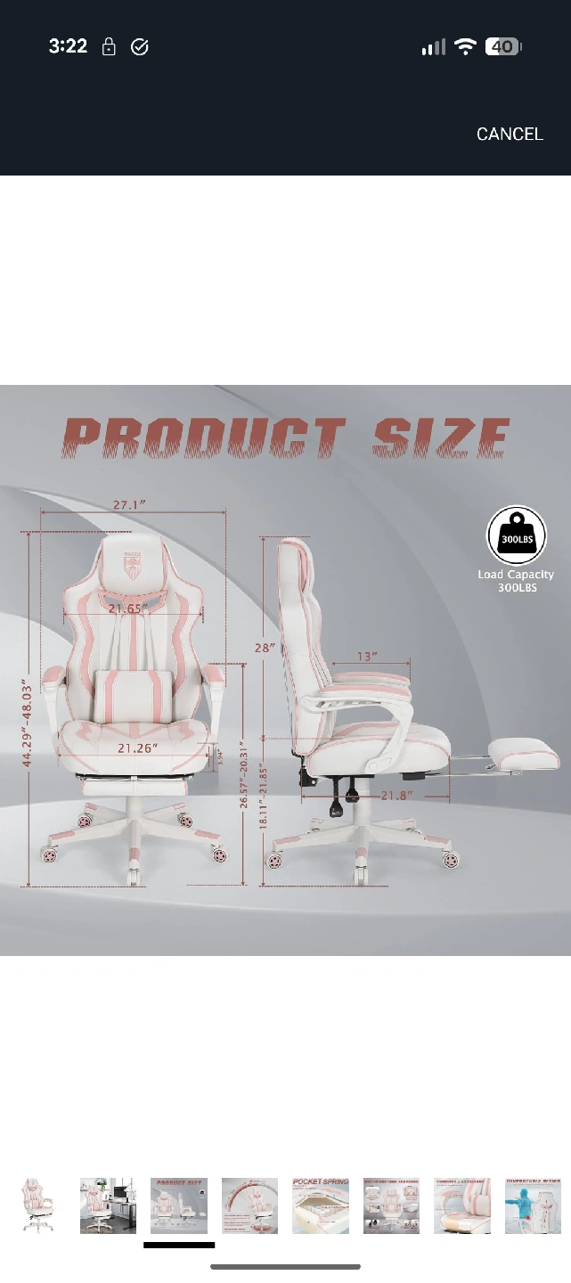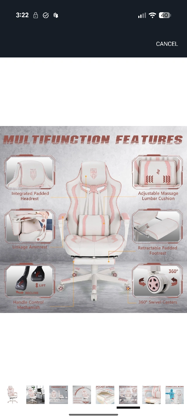 Looking to sell this Vonnesse gaming chair in a stylish pink and white colour scheme! It features an adjustable back angle, seat height, and 360-degree swivel for maximum comfort. The chair also comes with an integrated padded headrest, adjustable massage lumbar cushion, linkage armrest, and retractable padded footrest. It's designed with soft and breathable fabric, strong-supporting springs, and high-density foam for ultimate support! Dimensions are roughly 27.1" wide, 28" deep, and 44.29-48.03" high, with a load capacity of 300 lbs