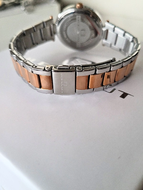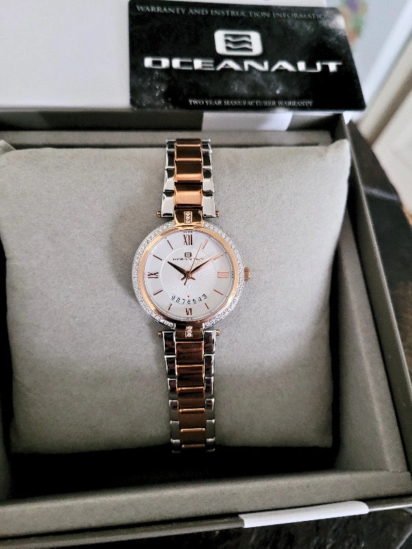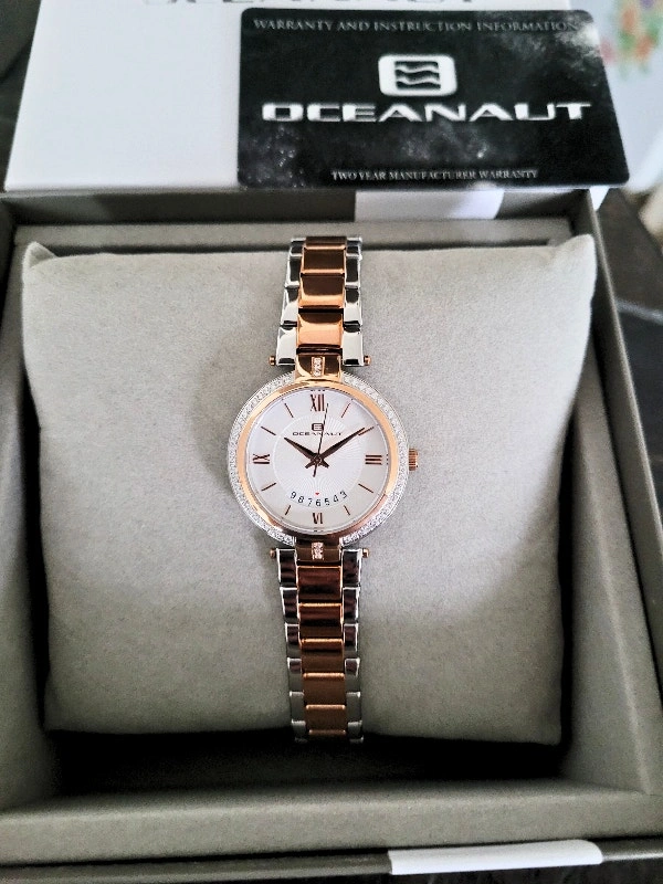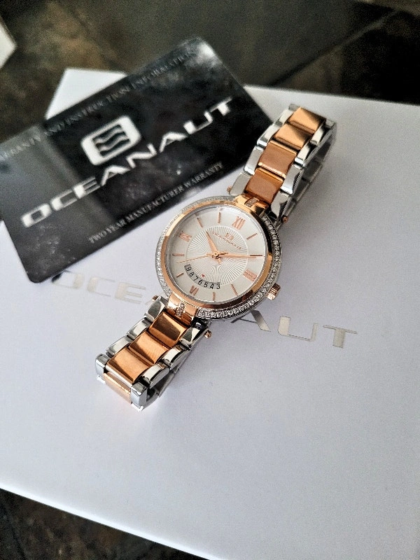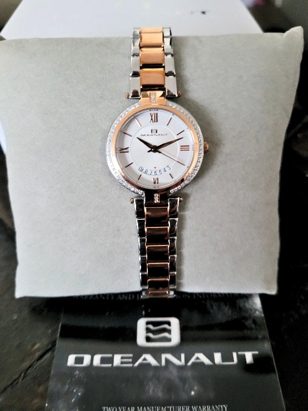 Brand new in the box with authenticity card. Retail value: $500 CAD / $350 USD. Model OC0294 Amaya. Case diameter 32 mm, thickness 8 mm. Band material: Stainless Steel, width 16 mm, color Rose Gold/Silver. Dial color: White. Bezel material: Stainless Steel. Calendar: Yes. Dial window material: Mineral. Movement: Quartz. Water resistant depth: 30 M. Pick up area: Sheppard & Don Mills. Cash accepted, cashless payment accepted.