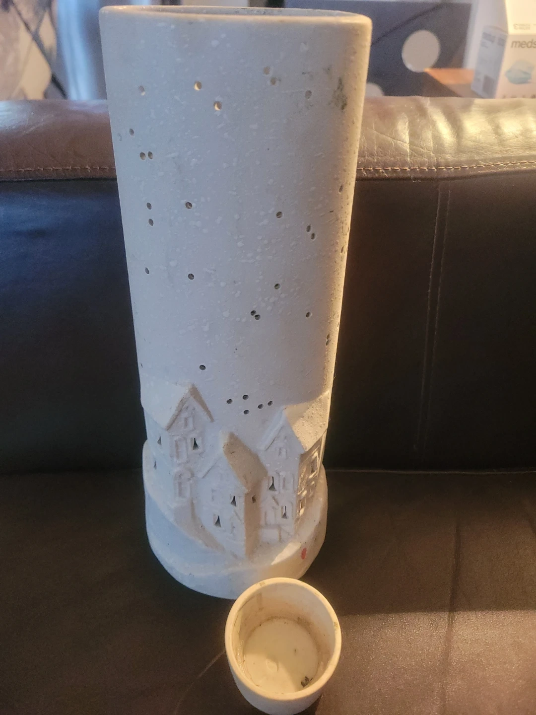 This cylindrical ceramic lantern features a charming village scene with cut-out windows. It has small holes at the top to allow light to escape. It's ideal for creating a cozy atmosphere indoors.
