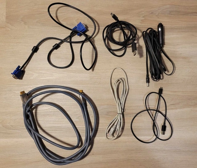 Clearing out some cables that I no longer have a use for. There is a VGA cable for connecting older monitors, an HDMI cable for modern displays, a USB cable, a car charger cable, and an ethernet cable for networking. Selling as a bundle. Cash accepted.