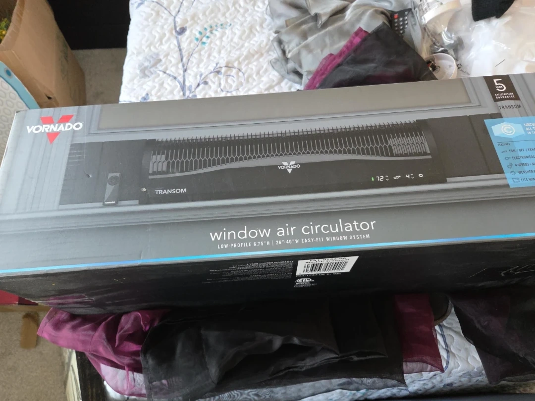 10Selling a Vornado Transom window air circulator! It's a low-profile system, measuring 6.75" in height and fitting windows 26"-40" wide. It features fan/off/exhaust modes, electronic controls, 4 speeds, and weather resistance. It fits windows easily!