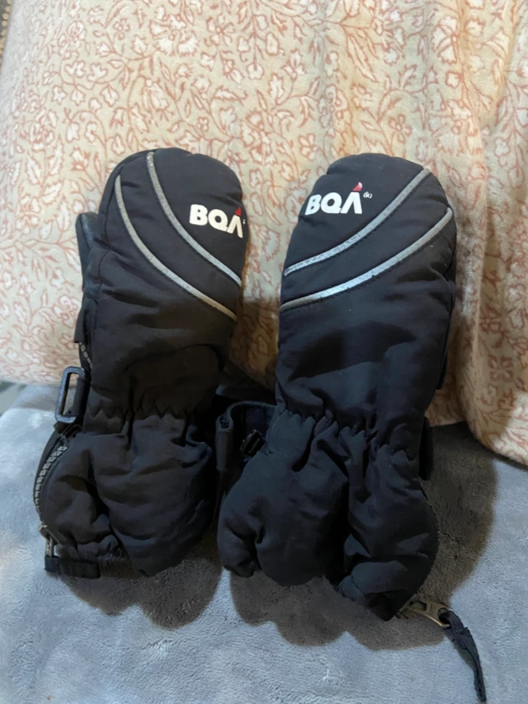 Pair of black mittens with BOA branding. Water-resistant outer shell. Hot paws are bigger but zipper is broken
