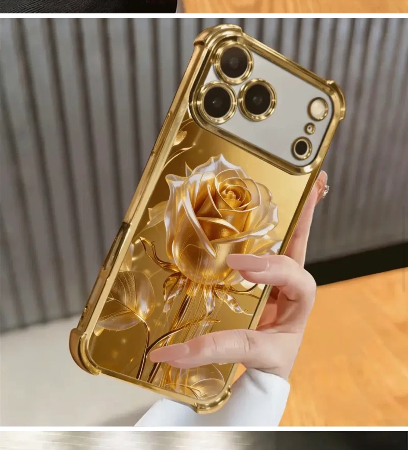 This phone case features a beautiful 3D gold rose design with a metallic gold finish. It's made with durable materials to protect your phone. This case offers a stylish way to guard your device!