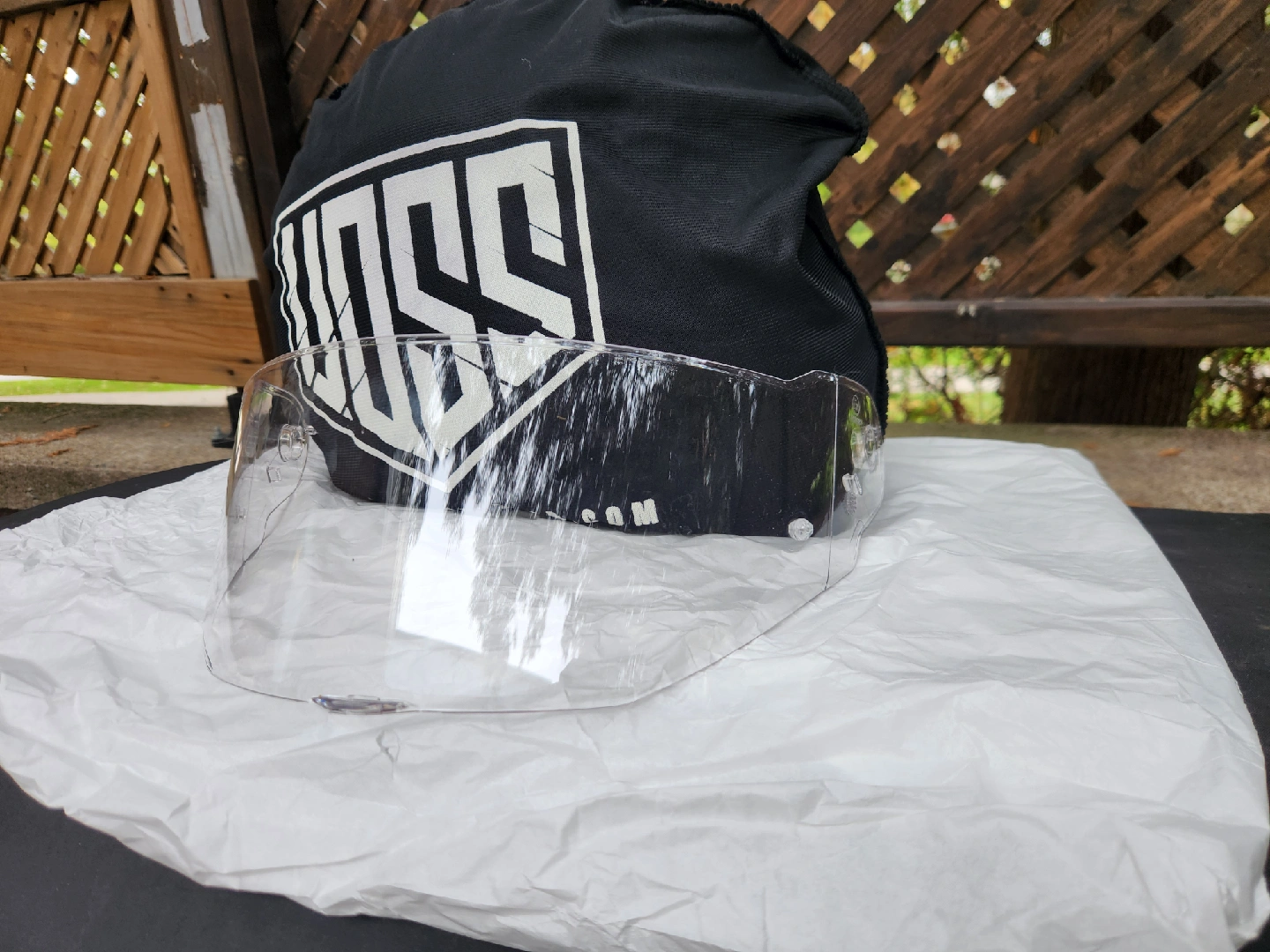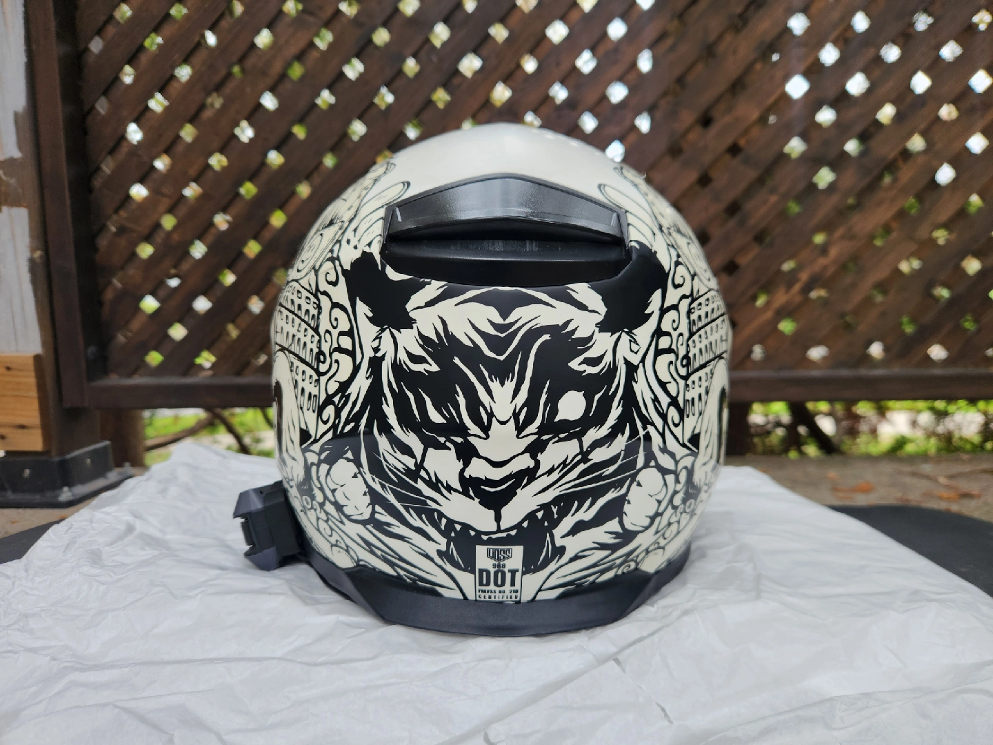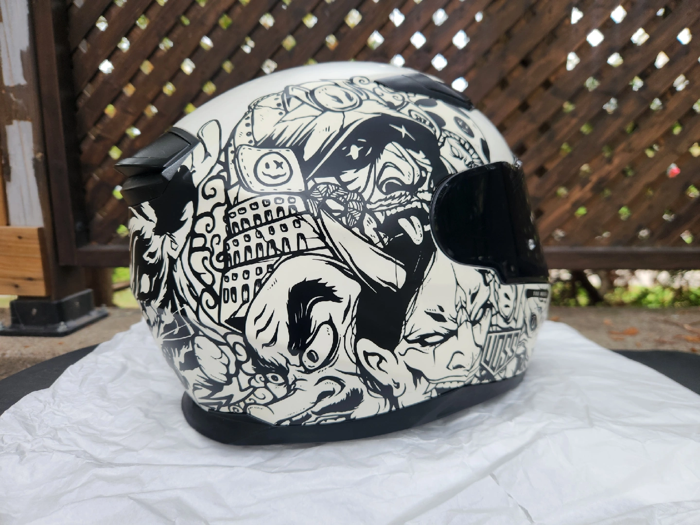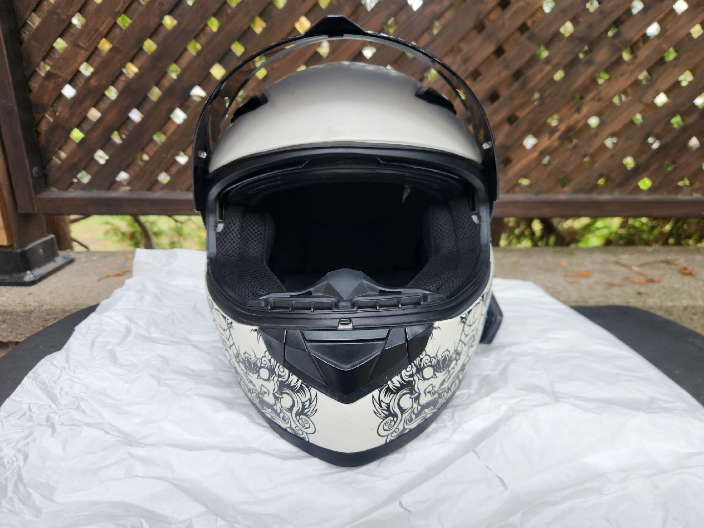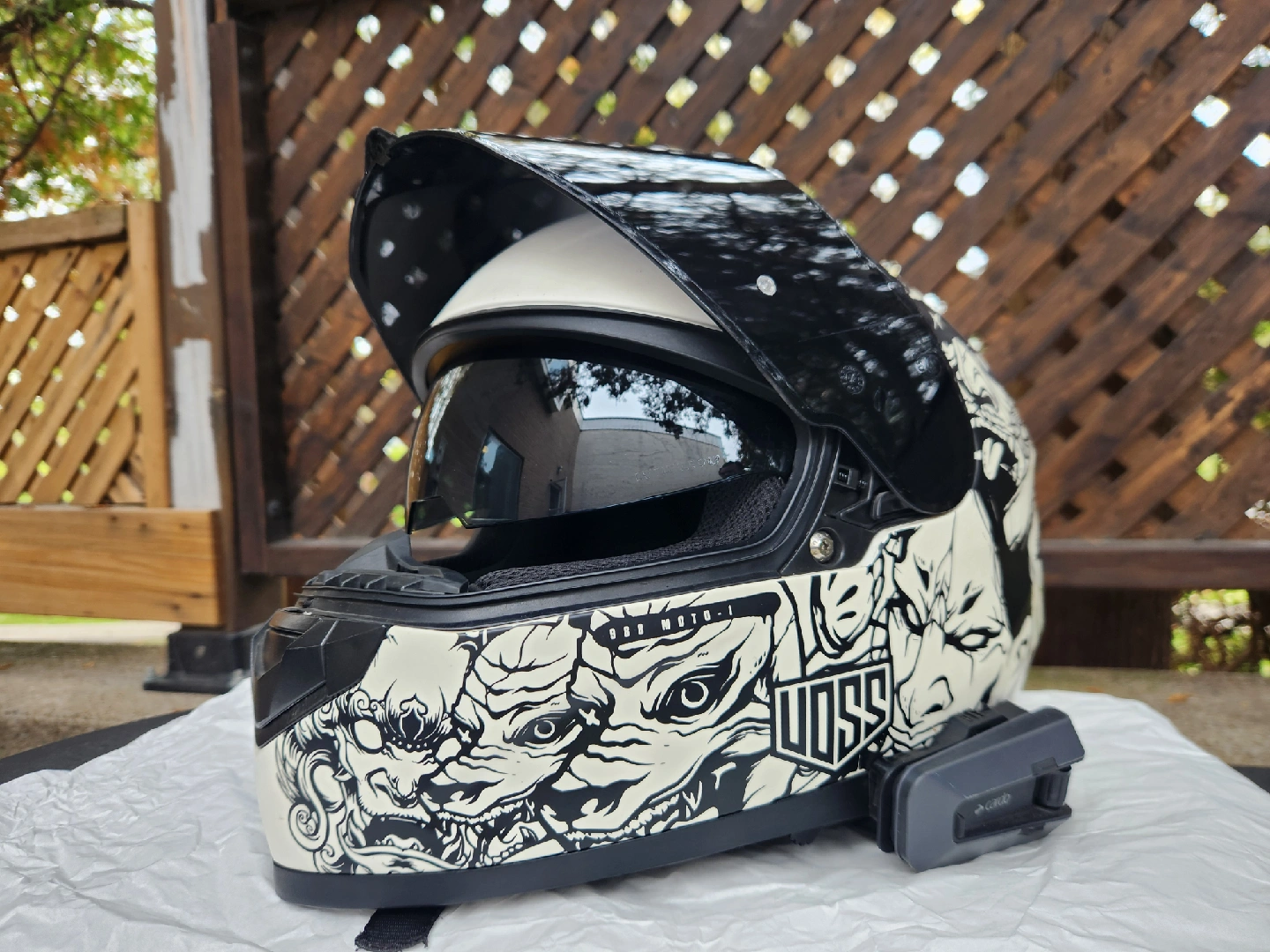 Selling a VOSS Motorcycle helmet - white and black graphic graffiti design. Never dropped. Black visor installed, comes with extra clear visor and soft storage bag. Original box. Cardo Packtalk Edge with HD speakers installed inside the helmet. Works perfectly fine.