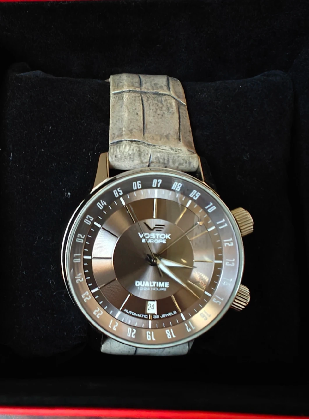 551Selling a Vostok Europe Dualtime watch. It comes with the original box and is in great condition. The watch is water-resistant to 5 ATM and has 32 jewels. The back casing is all stainless steel. A stylish and functional timepiece and a great addition to any watch collection. -limited edition 809/3000 made - Size: Ø 43mm x 14mm - Movement: Vostok 2426 Automatic -Water Resistance up to 50m -Stainless Steel Case -Anti Reflective Coating -Mechanical Automatic Movement -Second time indication in 24 hour format -Super Luminova Indexes -22mm Leather Strap Location: Downtown (Fort York/Liberty village area) or Vaughan (Bathurst/Rutherford). Cash only, no shipping, no trades.
