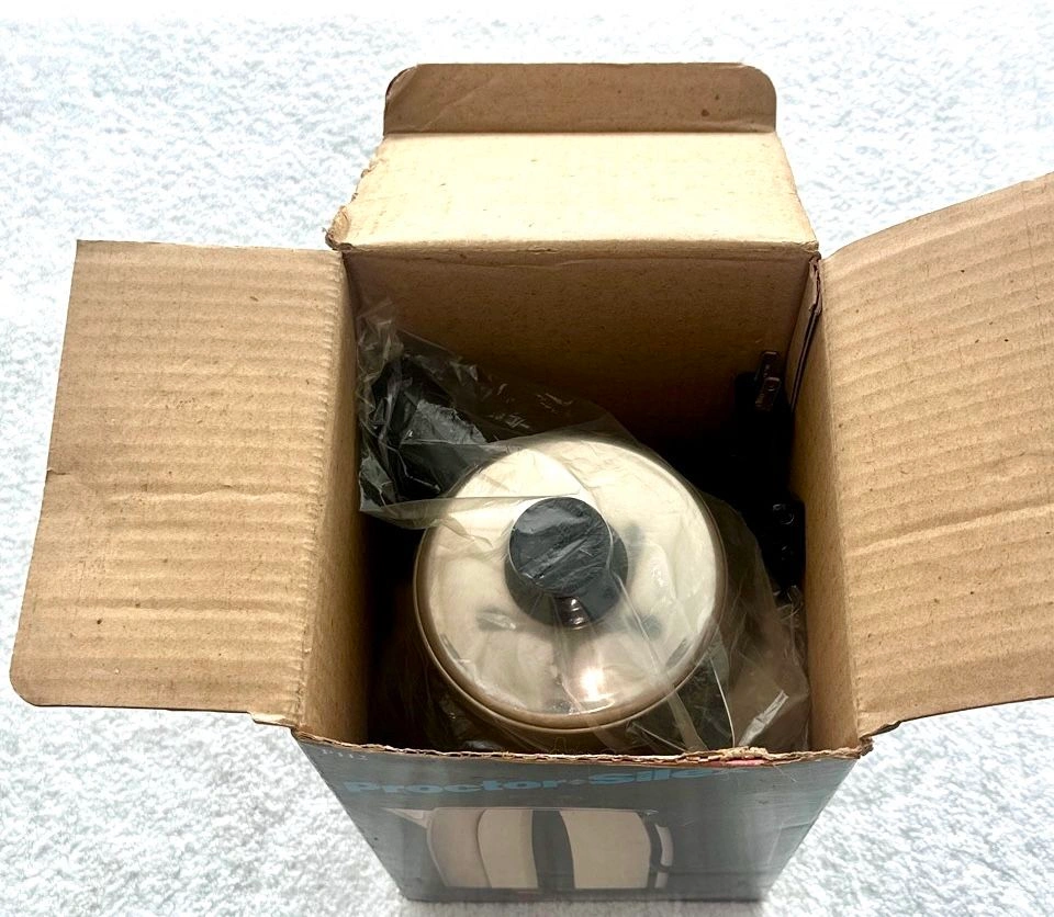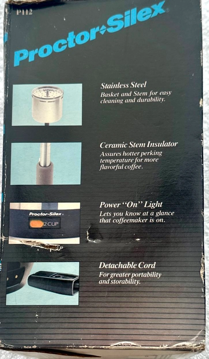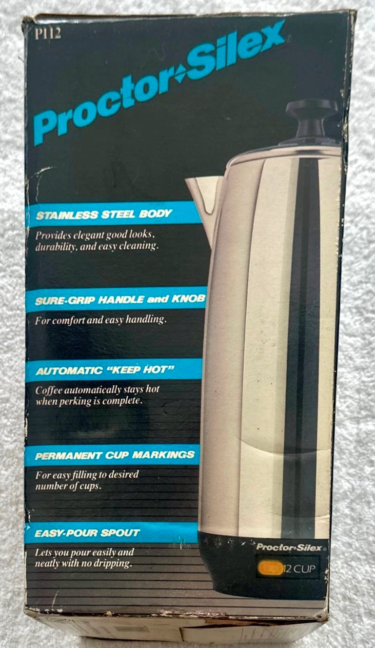 This is a vintage Proctor Silex electric coffee percolator, model P112, from 1987. It's a 12-cup capacity, made of stainless steel, and is new in its original box. It features automatic, superfast brewing, a 'Keep Hot' function, a sure-grip handle, easy-pour spout, and a detachable cord for portability. It's never been used and is fully operational. Perfect for a retro kitchen look! Buyer must pick up from the Morton Grove Area.