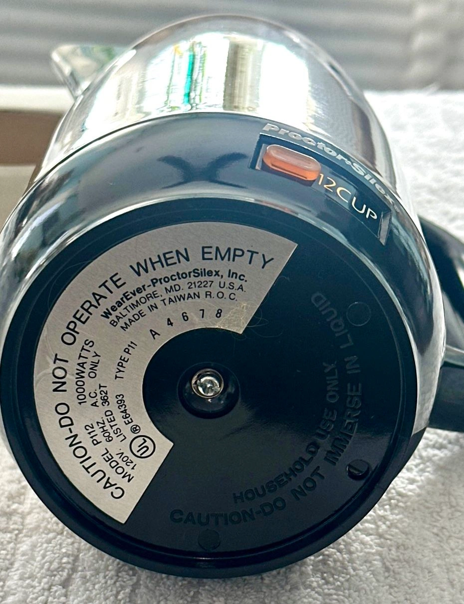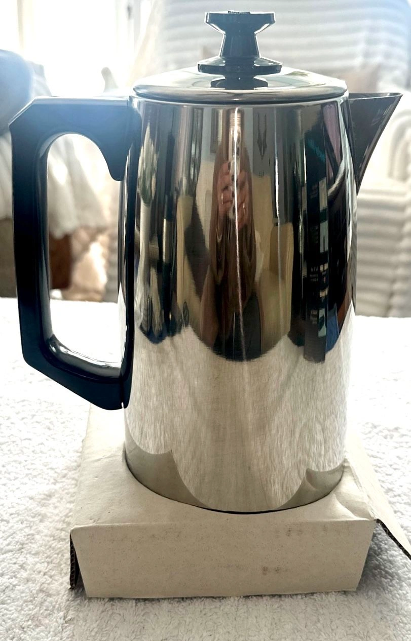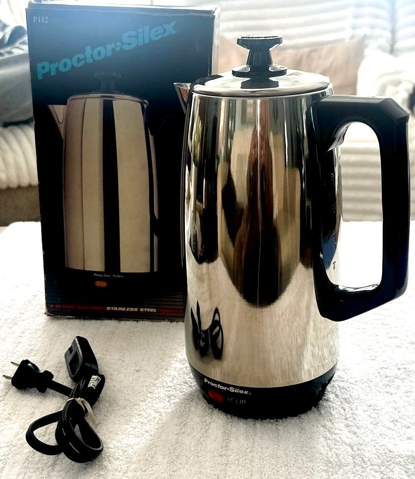 This is a vintage Proctor Silex electric coffee percolator, model P112, from 1987. It's a 12-cup capacity, made of stainless steel, and is new in its original box. It features automatic, superfast brewing, a 'Keep Hot' function, a sure-grip handle, easy-pour spout, and a detachable cord for portability. It's never been used and is fully operational. Perfect for a retro kitchen look! Buyer must pick up from the Morton Grove Area.