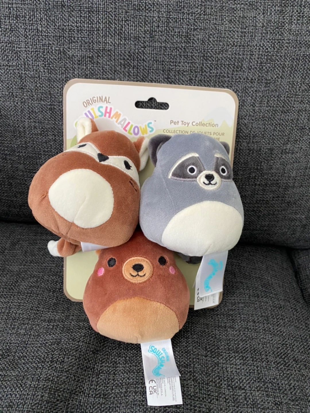 Set of 3 Squishmallow plush dog toys. Each toy has a different design. Includes a fox, raccoon, and bear. All have a soft and cuddly texture with a squeaker inside.