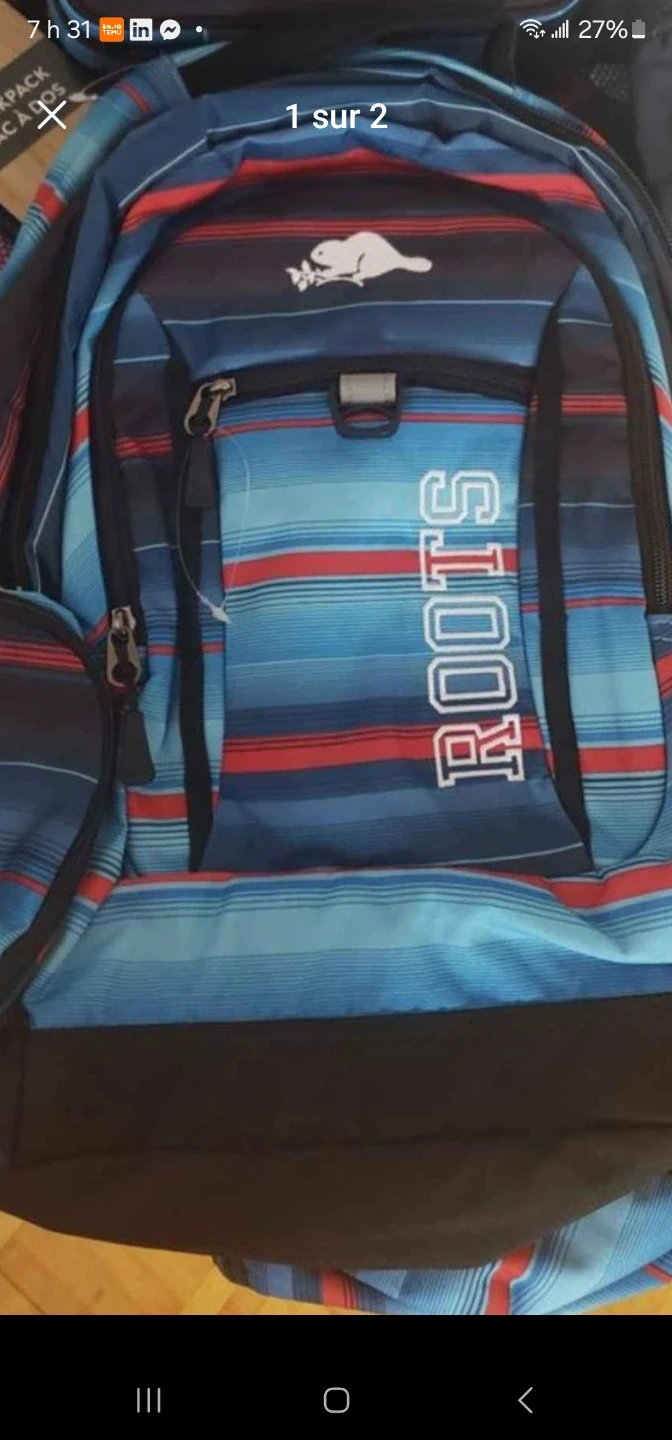 Sac à dos Roots avec le logo du castor. Couleur bleue avec des rayures rouges. Parfait pour le transport quotidien ou l'école.