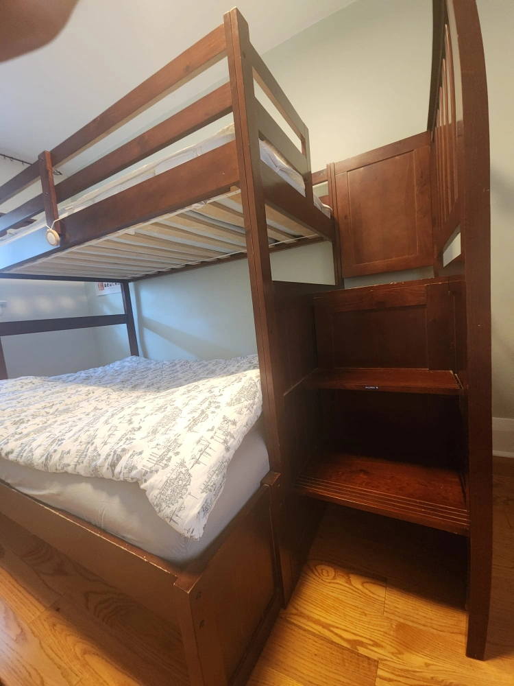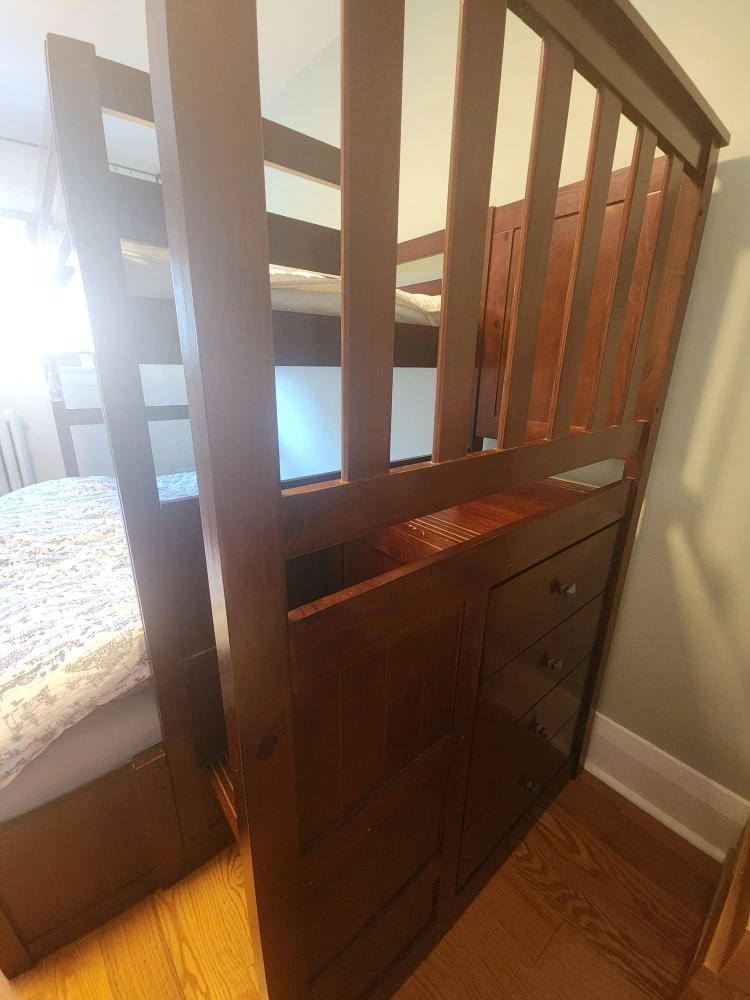 Solid wood cappuccino color bunk bed, twin over full. By Donco kids. Solid stairs, storage drawers on the side. Very sturdy and safe. Our son loves it, but we are downsizing.