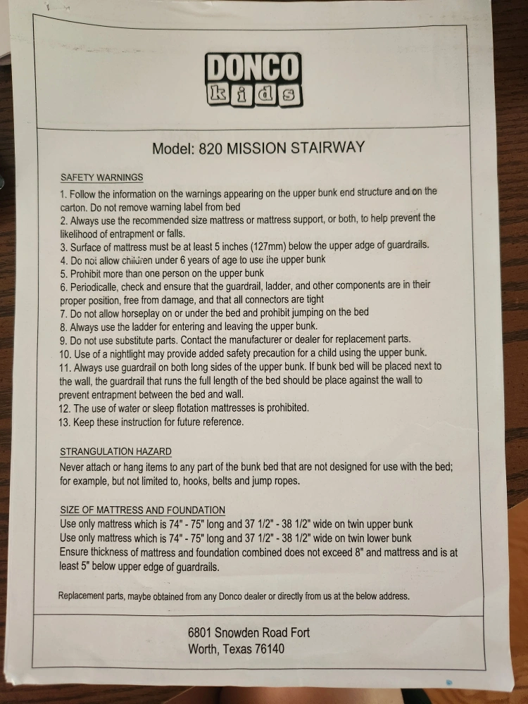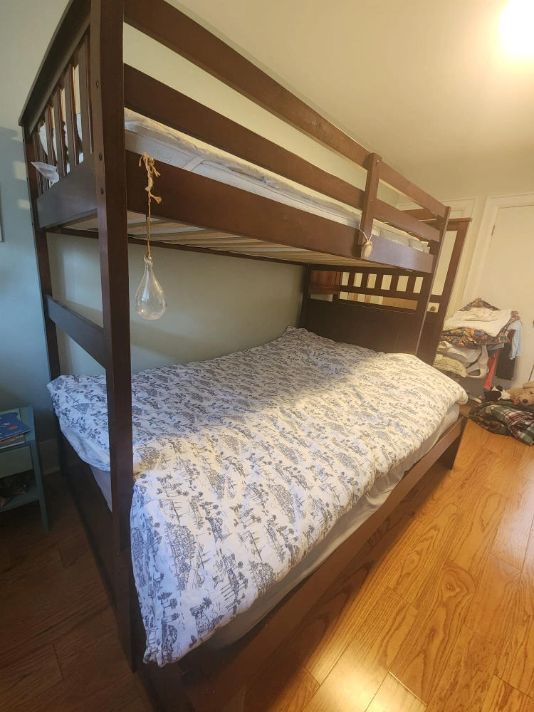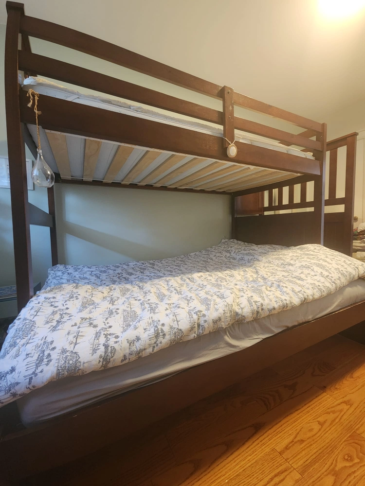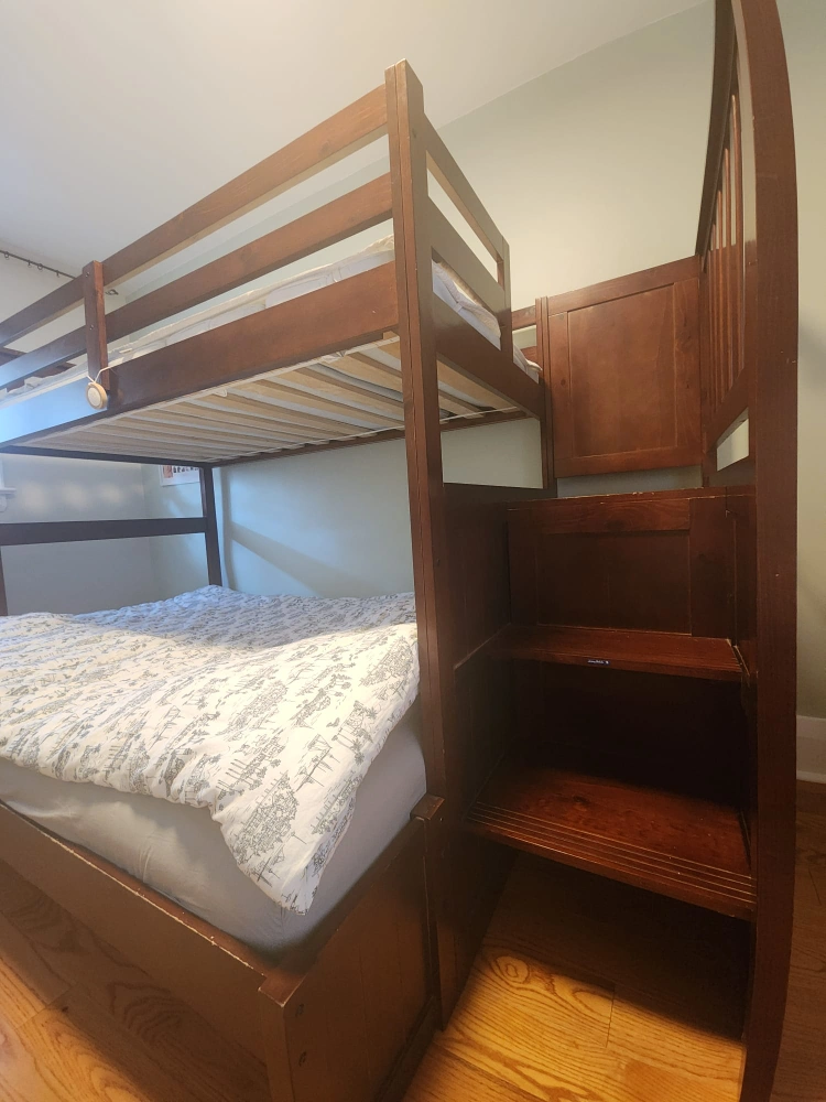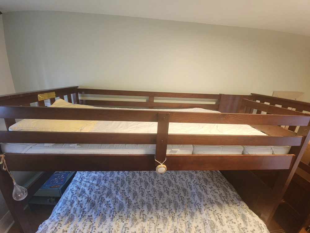 Solid wood cappuccino color bunk bed, twin over full. By Donco kids. Solid stairs, storage drawers on the side. Very sturdy and safe. Our son loves it, but we are downsizing.