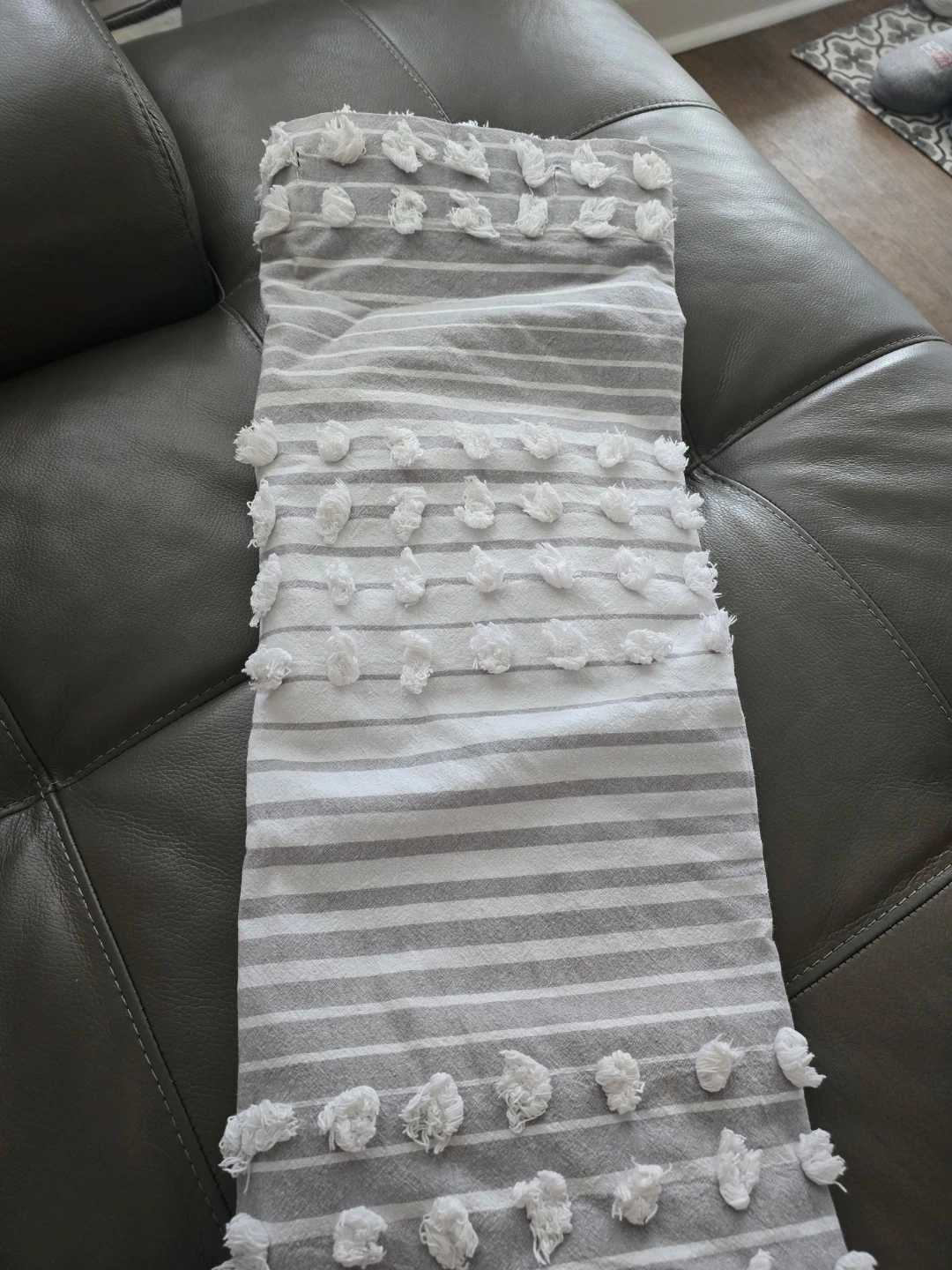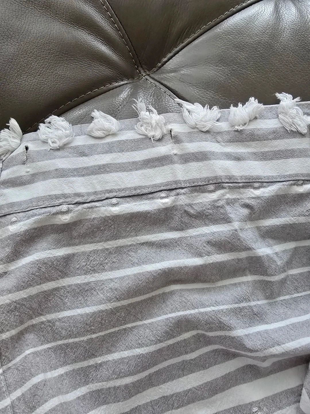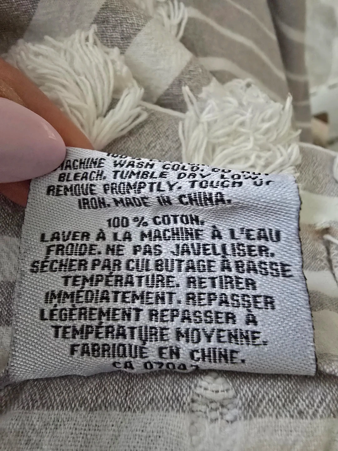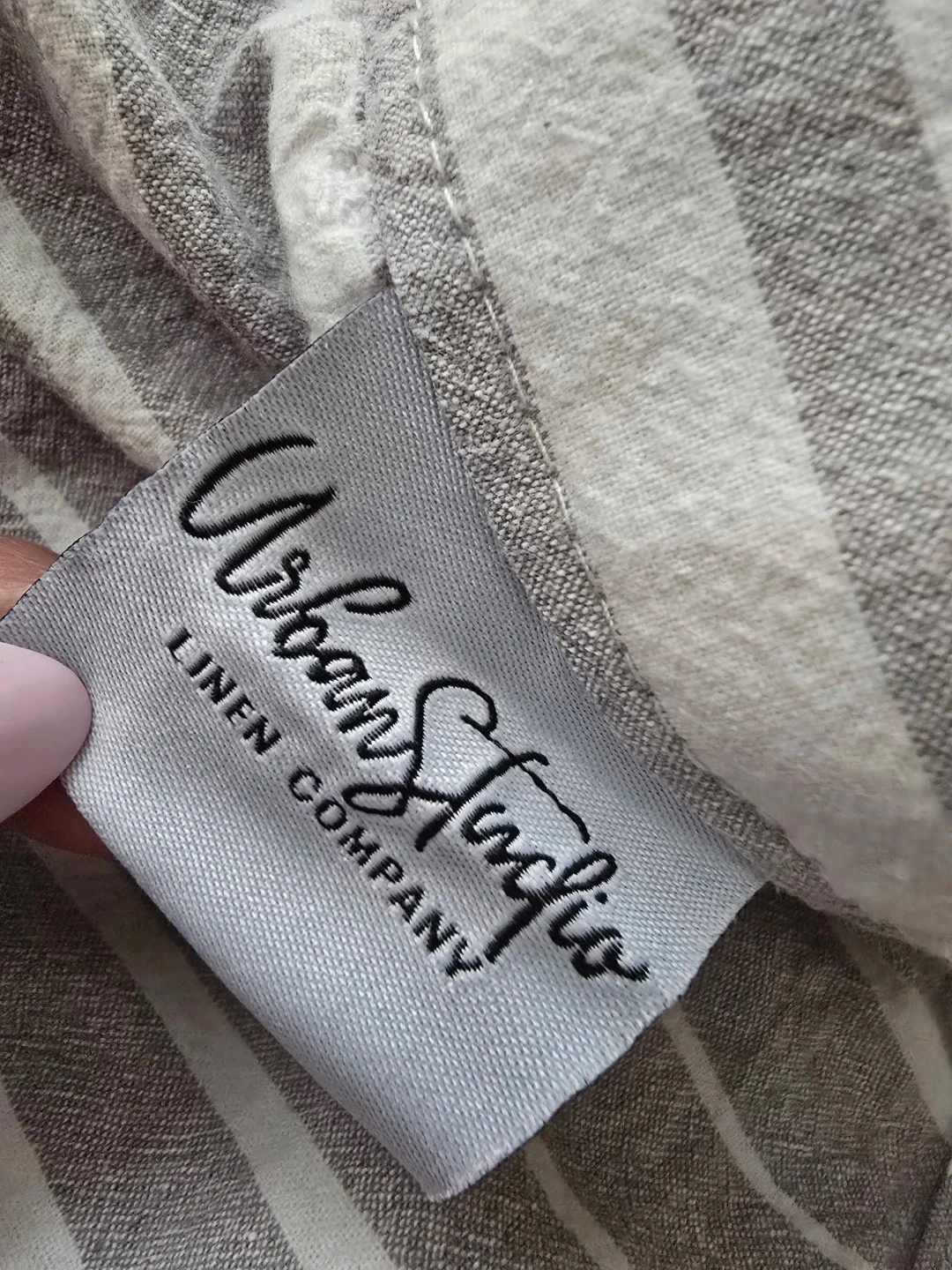 This is a shower curtain from Urban Studio Linen Company. It's made of 100% cotton and features a striped pattern with tufted tassels. Machine wash cold, tumble dry low. Made in China.