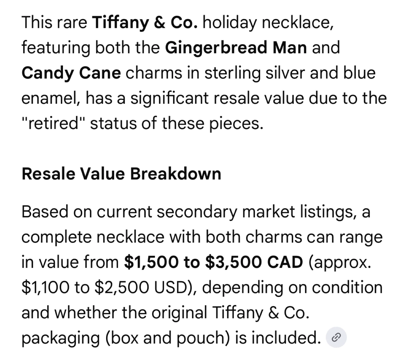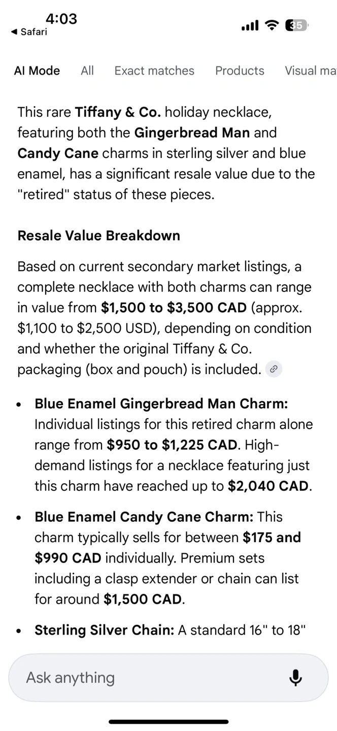 The gingerbread man alone has sold for over $2000 in similar condition. With the candy cane and the original silver chain, my reasoning for this price is valid. That said, I’m still open to offers. I just won’t go below a certain amount. Especially considering the condition of these charms are mint (despite being tarnished).
