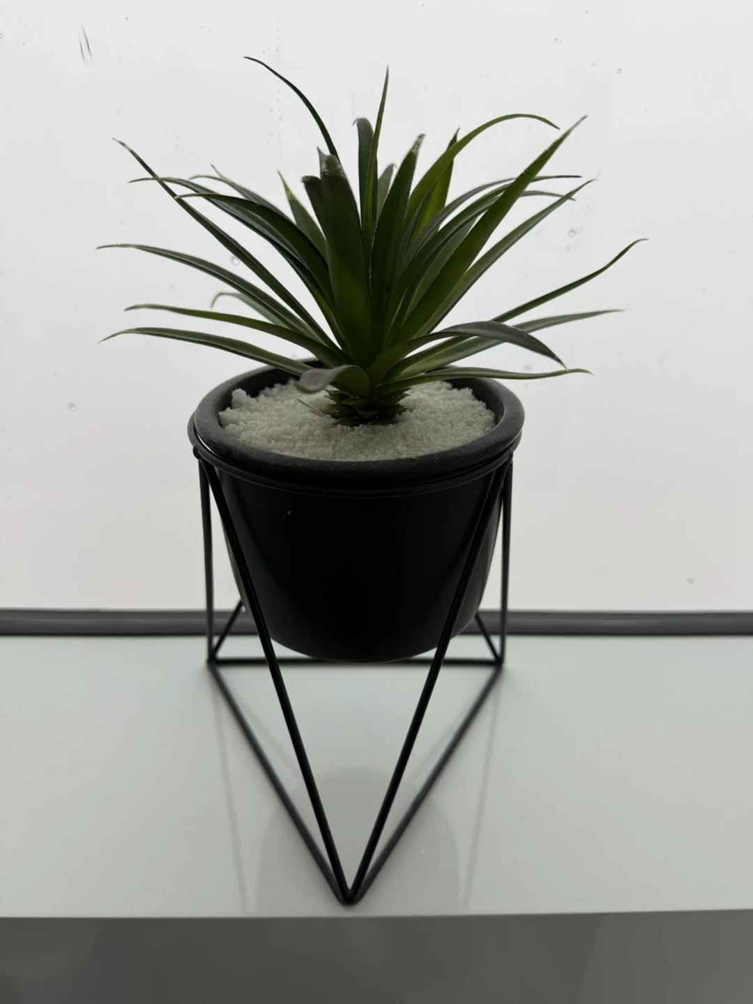 It's a faux succulent plant in a black metal geometric planter. The planter is filled with small white decorative stones. This small plant adds a touch of greenery to any space.