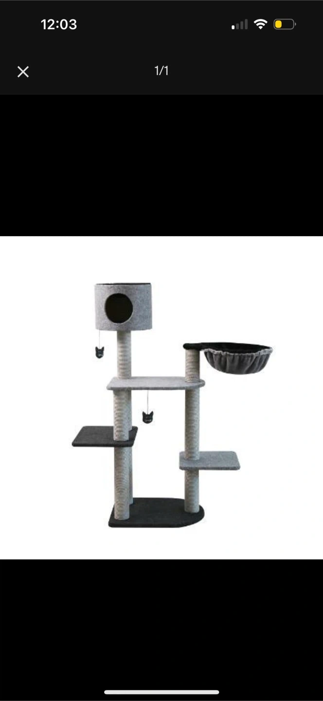 A versatile cat tree featuring scratching posts, platforms, a cozy condo, and a hanging hammock. It's covered in plush grey fabric with durable sisal rope for scratching. This tree provides multiple levels for your cat to climb, perch, and play! needs work on the baskets as they are ripped. its in great shape otherwise, if your looking for a project this tree has a lot of life left.