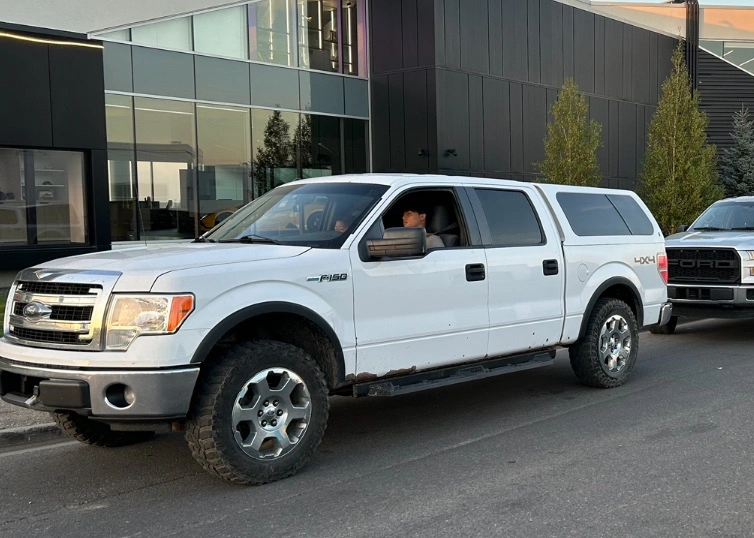 White Ford F150 truck with a hard cover on the back. 336k. Brand new: brakes, tie rods, running boards, airbag suspension, windlshield and side mirrors. Includes: trailer tow package with brake controller, Bluetooth, 35” all terrain tires on 20” rims.