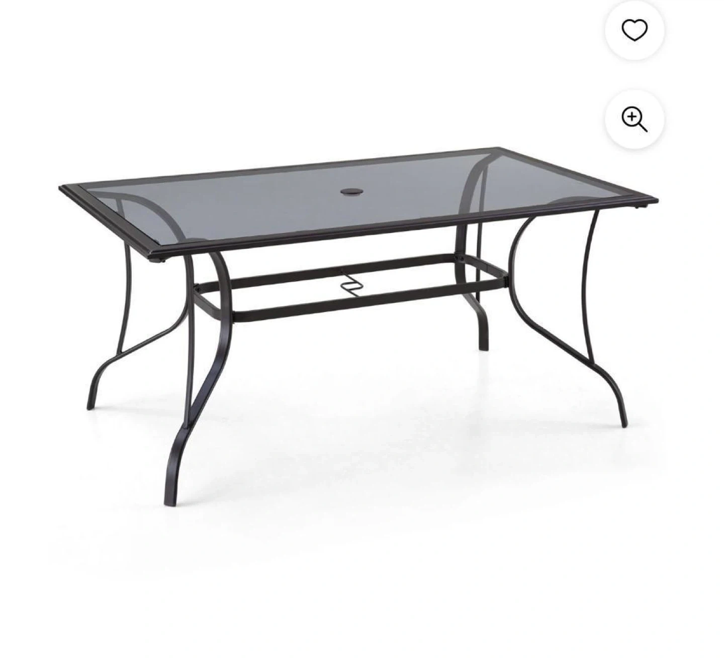 Outdoor patio table with a glass top and metal frame.