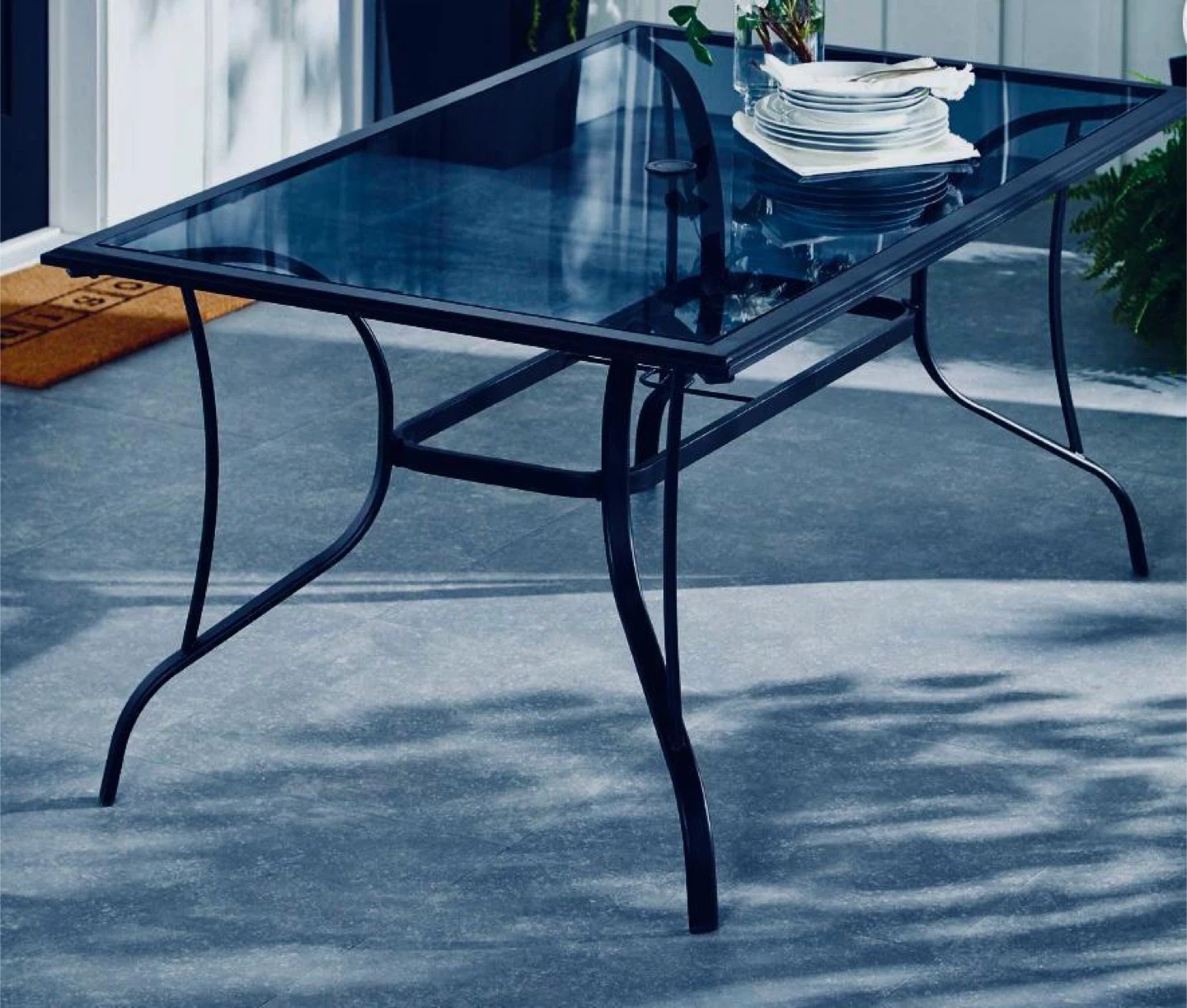 Outdoor patio table with a glass top and metal frame.
