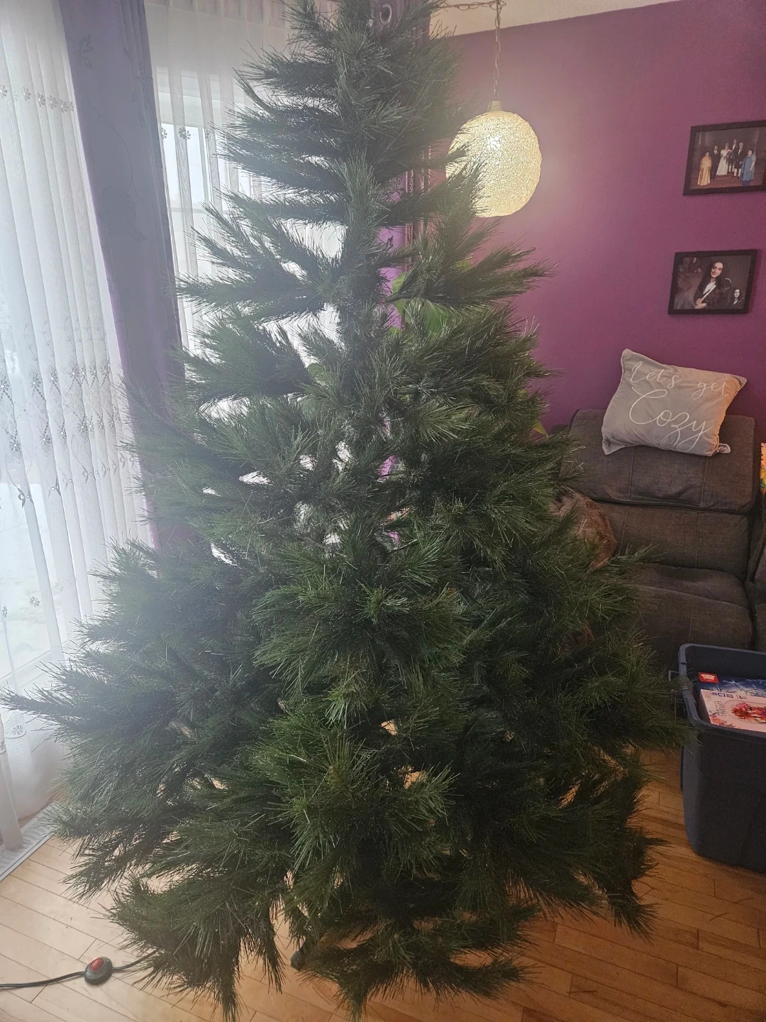 7ft tall. Artificial Christmas tree. It has been well loved just no longer need as we bought a new one this year. Easy to assemble and take down.