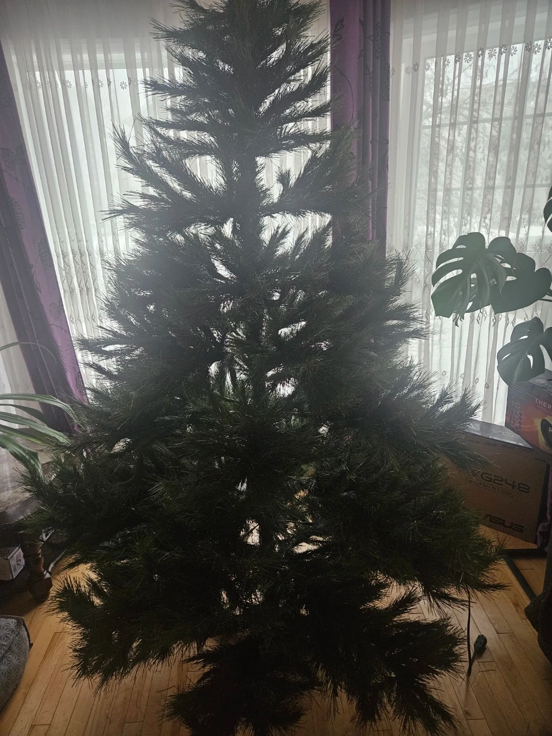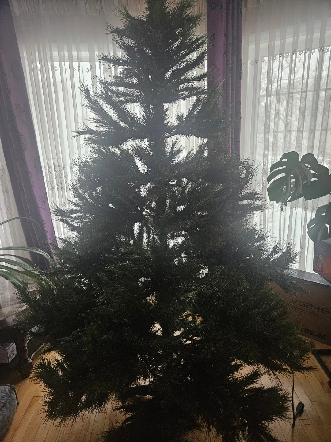 7ft tall. Artificial Christmas tree. It has been well loved just no longer need as we bought a new one this year. Easy to assemble and take down.