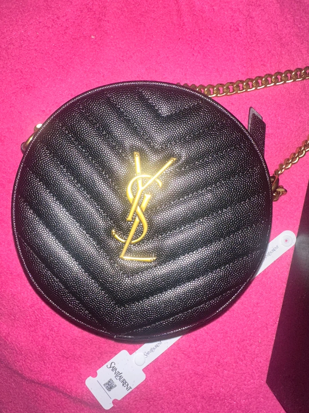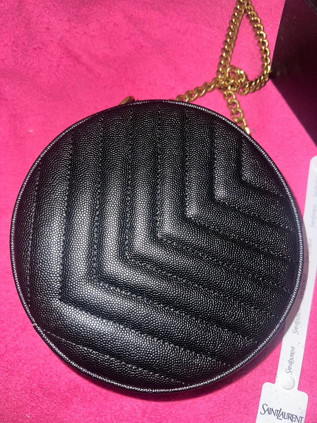 This is a Saint Laurent black quilted leather round bag. It features a gold-tone YSL logo and a gold-tone chain strap. Includes original box and dust bag.