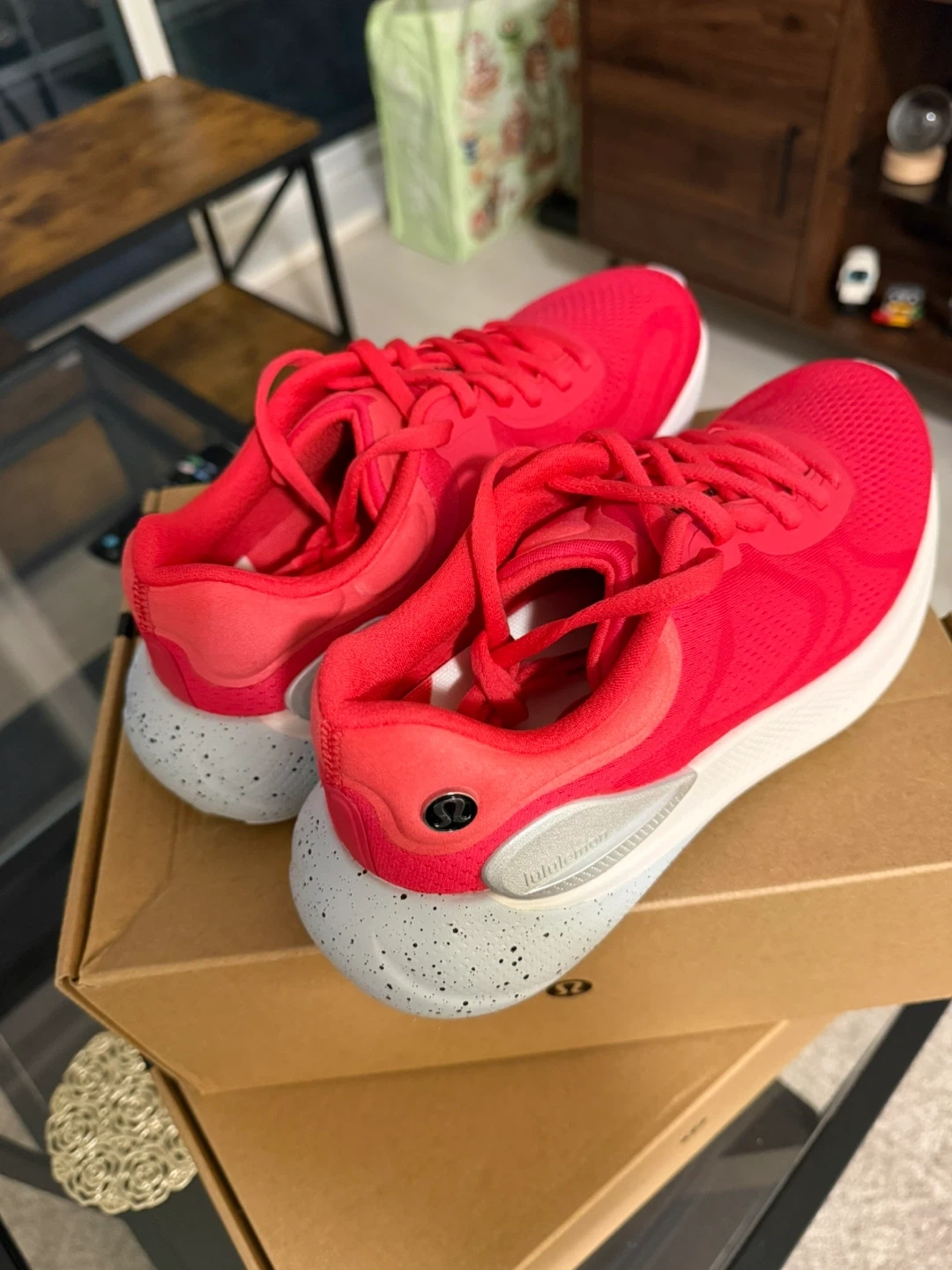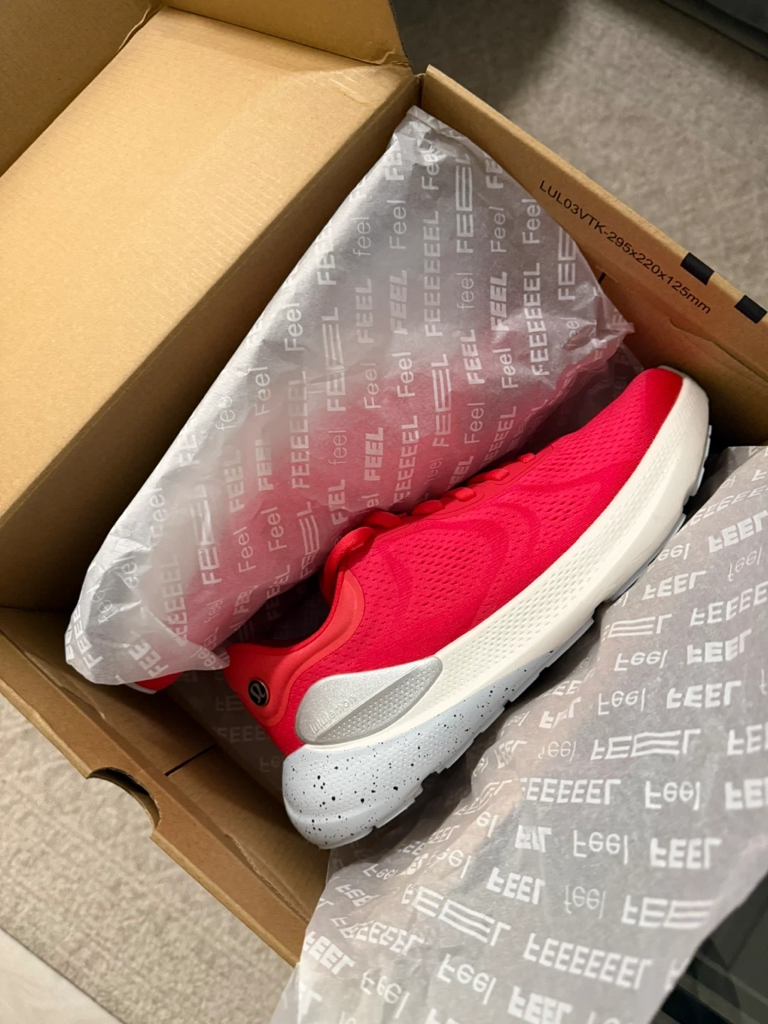 These bright red Lululemon running shoes are ready for your next workout. They feature a breathable mesh upper and a comfortable cushioned sole. Includes the original box and packaging. Size 8.5