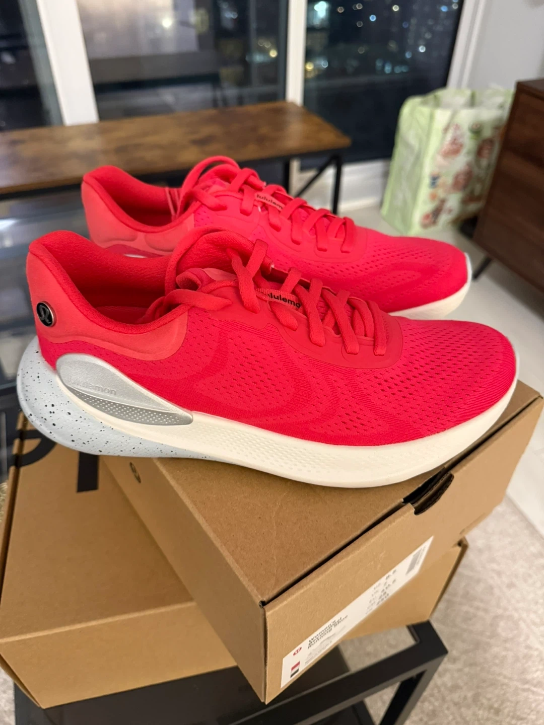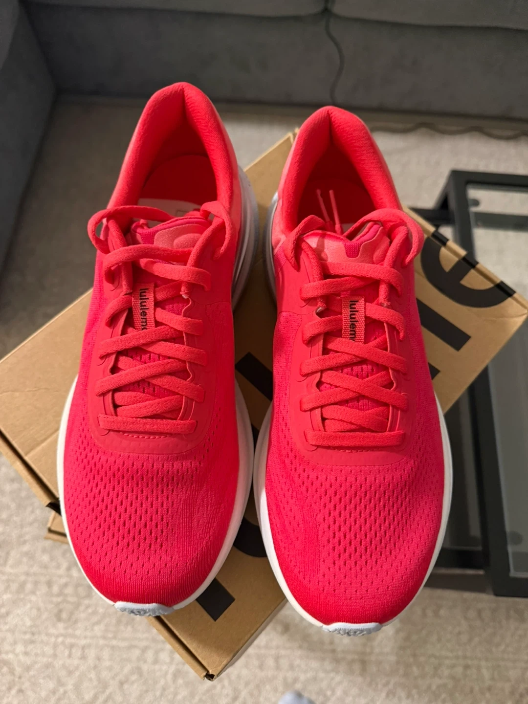 These bright red Lululemon running shoes are ready for your next workout. They feature a breathable mesh upper and a comfortable cushioned sole. Includes the original box and packaging. Size 8.5