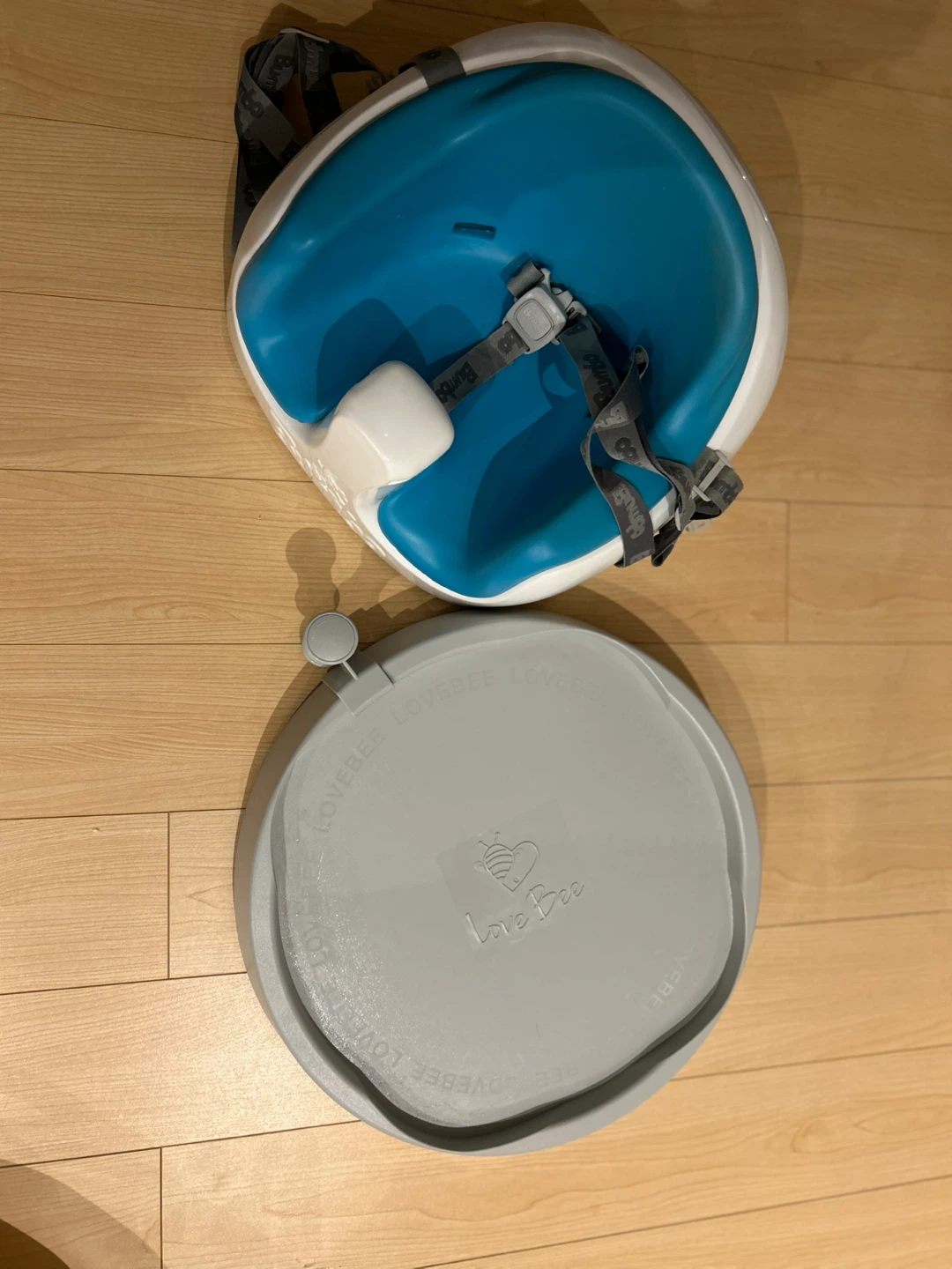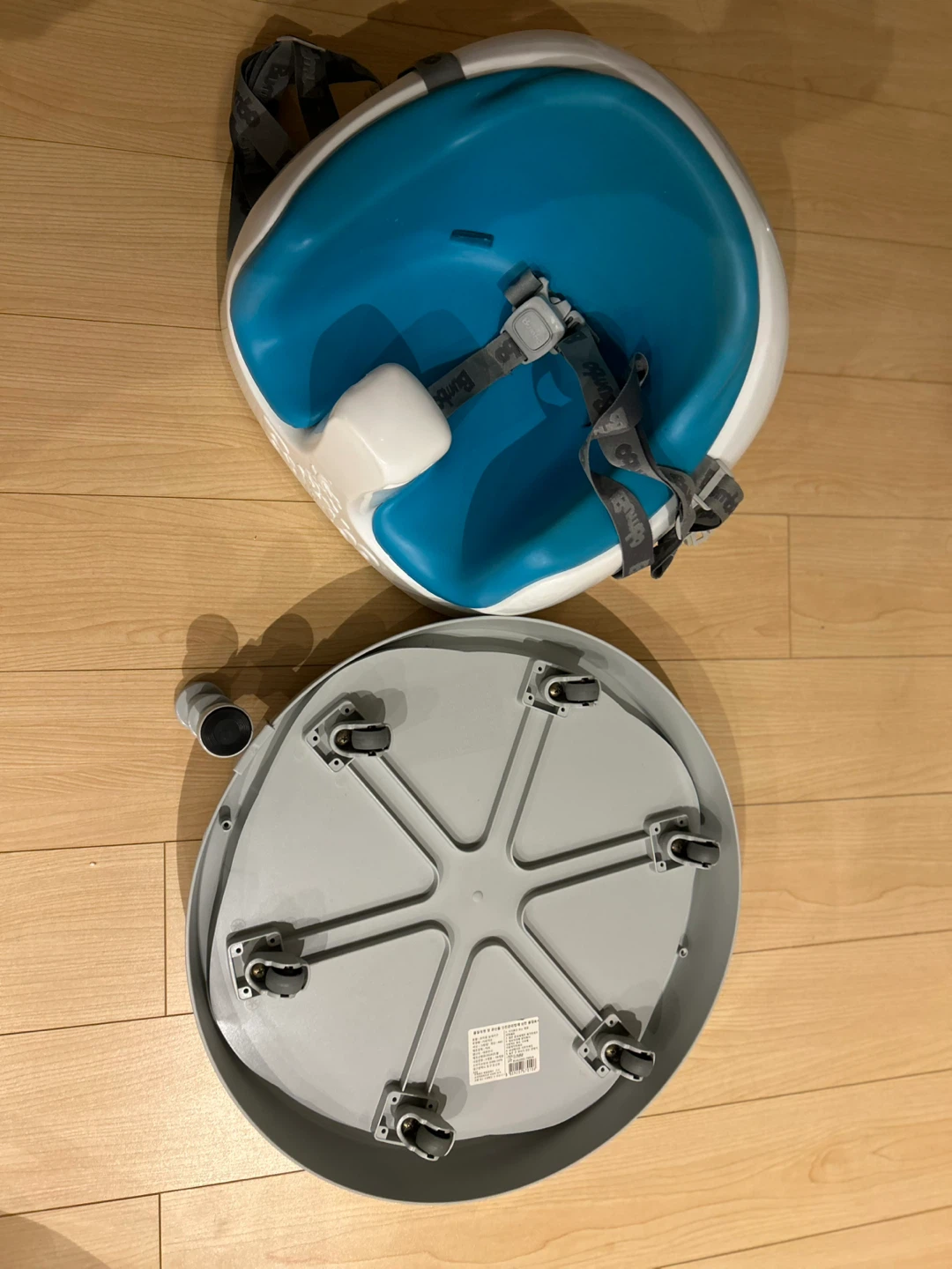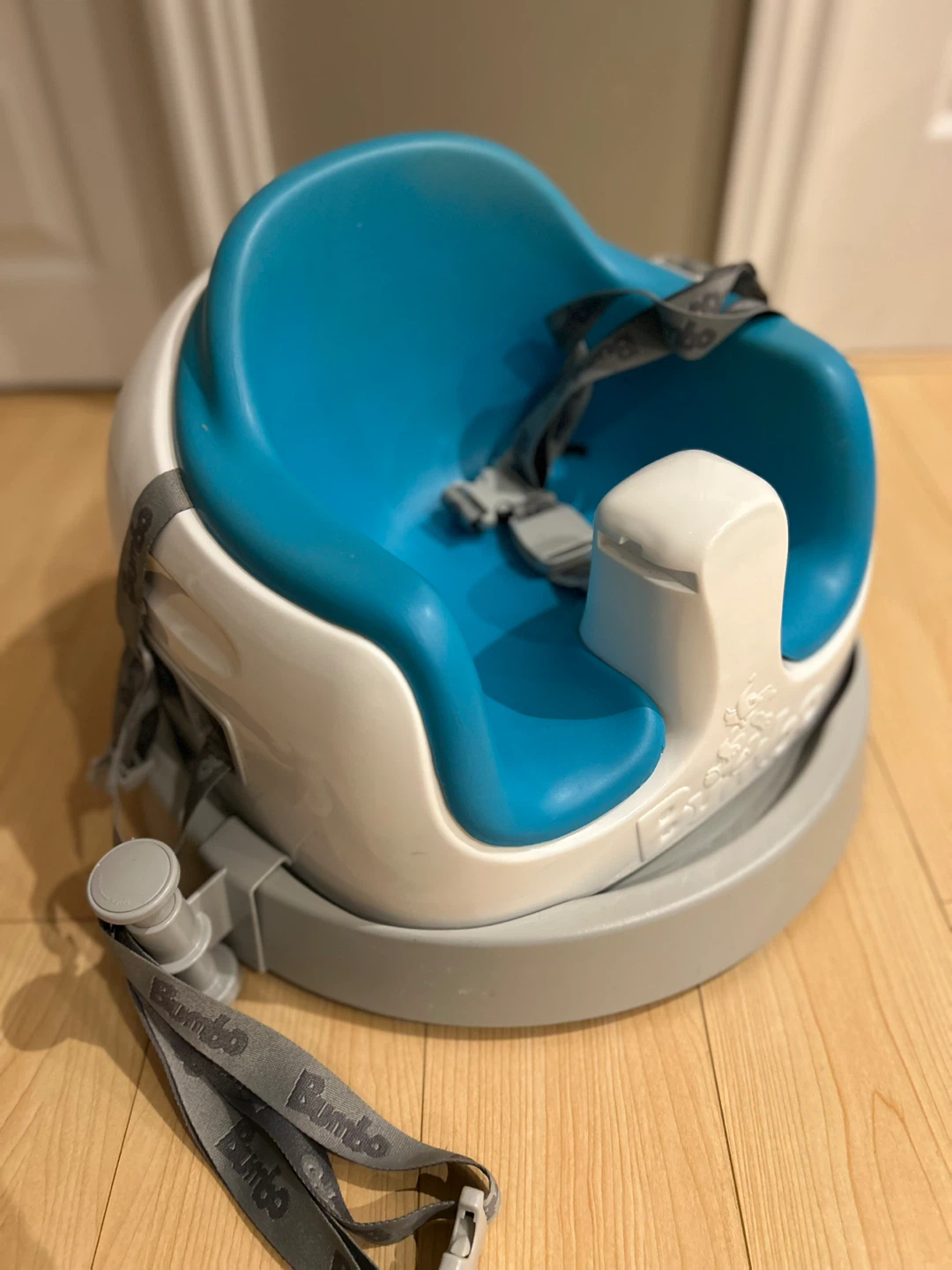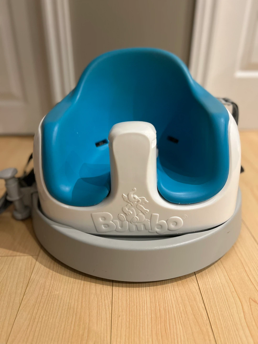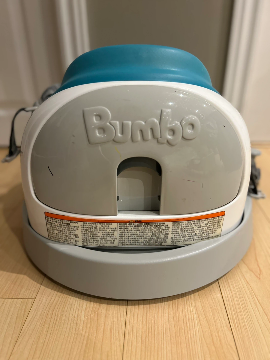 This Bumbo baby seat is a blue and white floor seat with a moving tray. It includes safety straps and the base has wheels. It's designed to help babies sit up. 🚗Please contact for pick-up location (North York, Thornhill, Markham, Scarborough) 찡찡거릴때 줄 매달고 거실 한바퀴씩 돌곤 했던 추억이…. 담긴 범보의자입니다🥹 스크래치는 있지만 사용하는데 전혀 문제없고 최대한 깨끗이 사용했습니다~ 🚗 쏜힐, 노스욕, 마캄, 스카보로 (왔다갔다 하는 길이면 시간 맞춰서 거래장소 변경 가능해요)