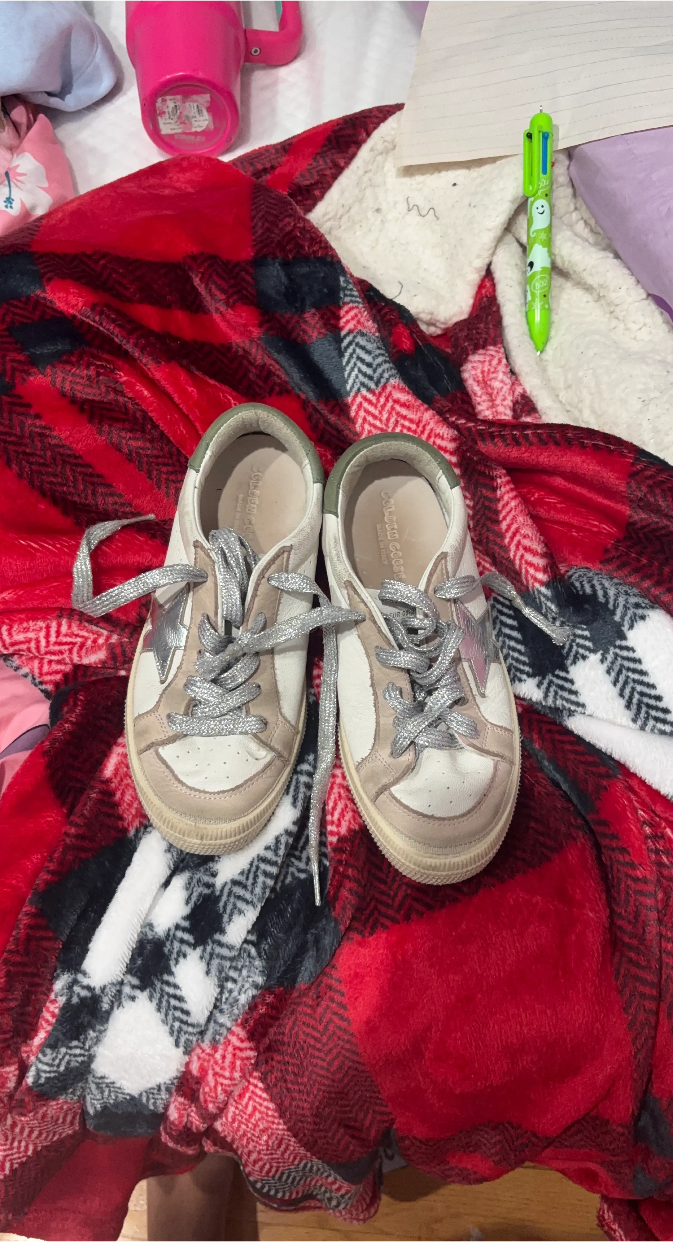 Golden Goose Superstar sneakers in white with taupe accents and silver star details. Made in Italy. These stylish low-top sneakers feature a distressed finish and come with silver glitter laces. Perfect for adding a touch of designer flair to any casual outfit! They’re dirty not that dirty though