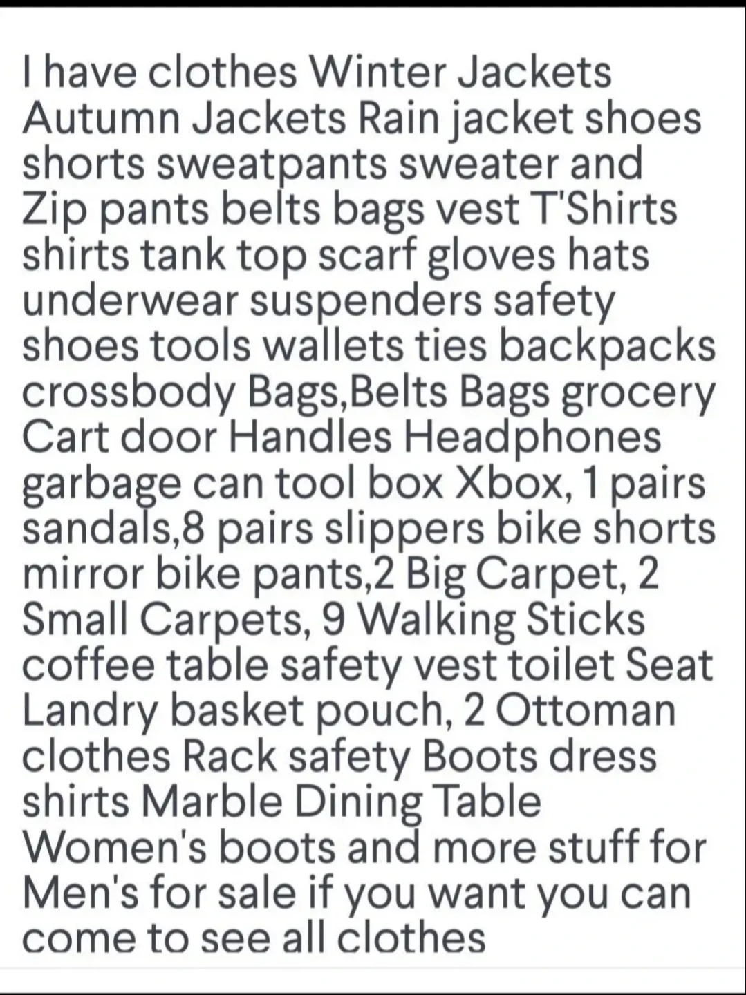 I have and clothes jackets for Winter Autumn Jackets Rain jacket shoes Long sleeve T'Shirts all size and more clothes for Men's and Boys for sale different prices different colors and different Brands if you want you can come to see all clothes and jackets only cash.