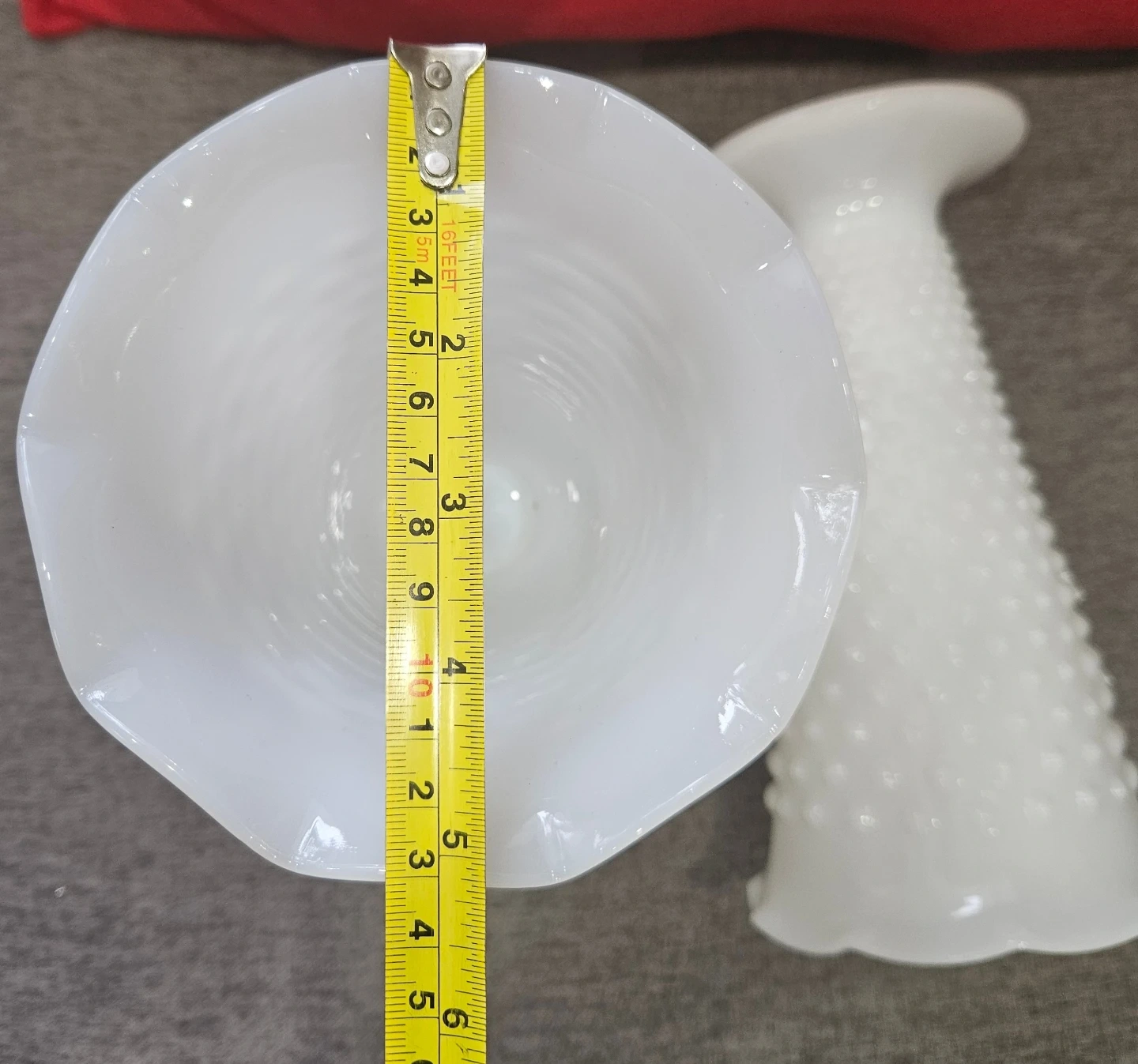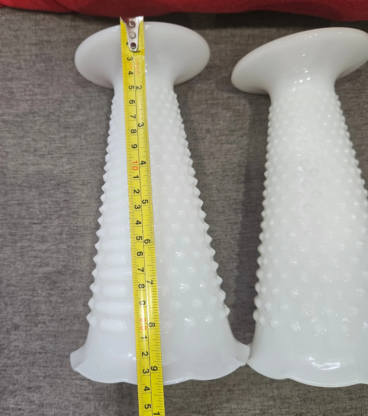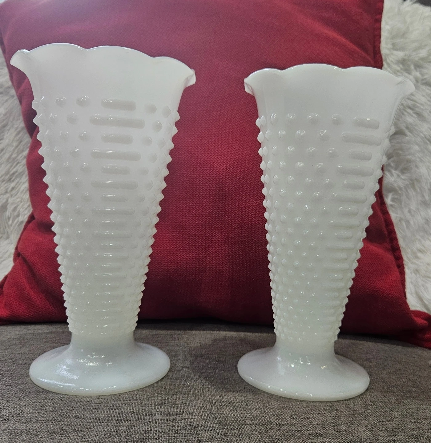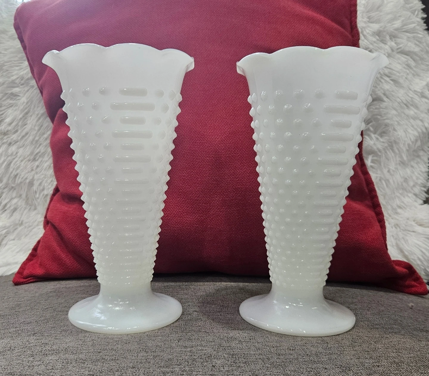 Two white hobnail milk glass vases with ruffled rims. One vase measures approximately 8.5 inches tall, and the other is about 9 inches tall. These decorative pieces would add a vintage touch to any room.