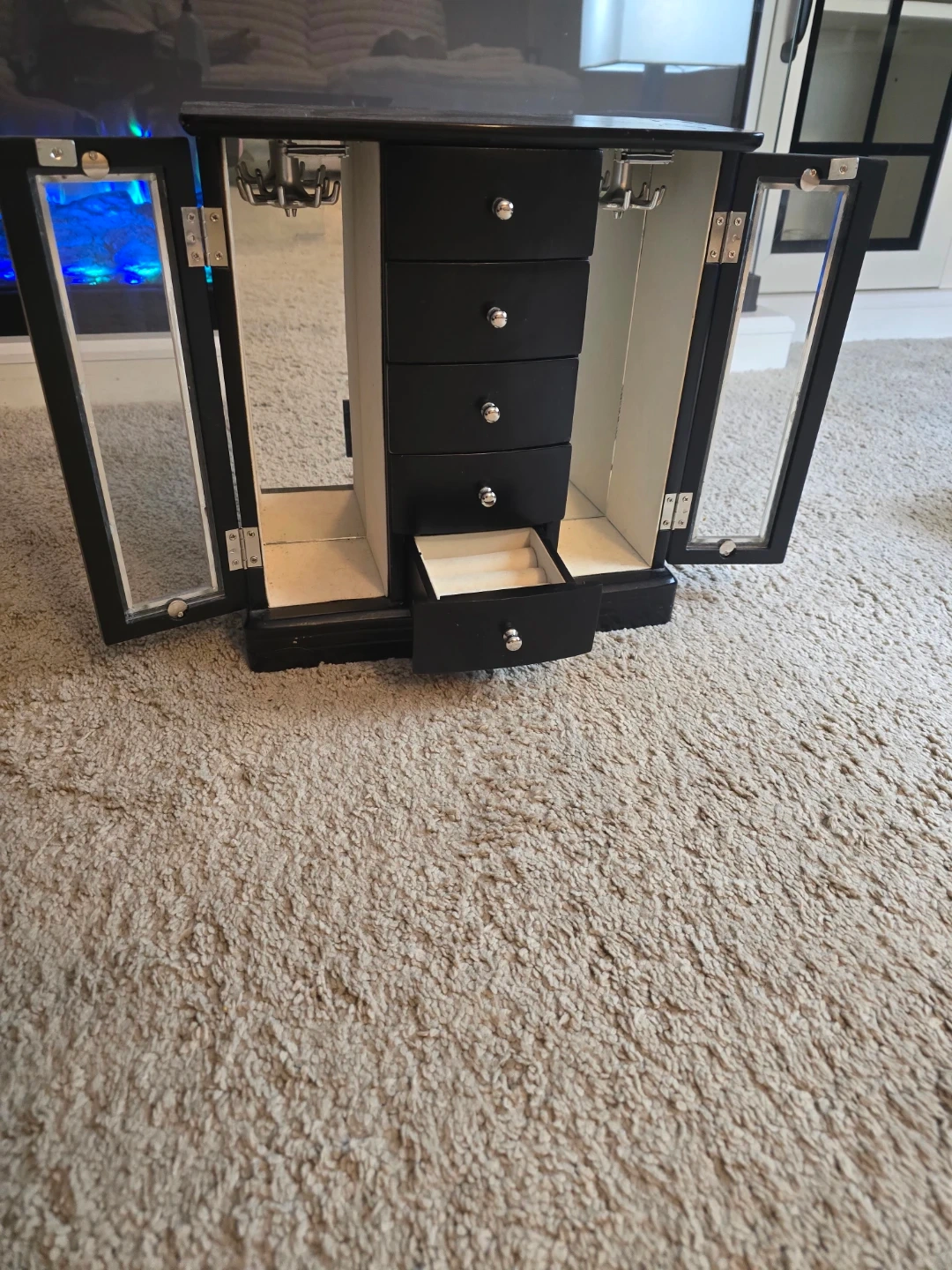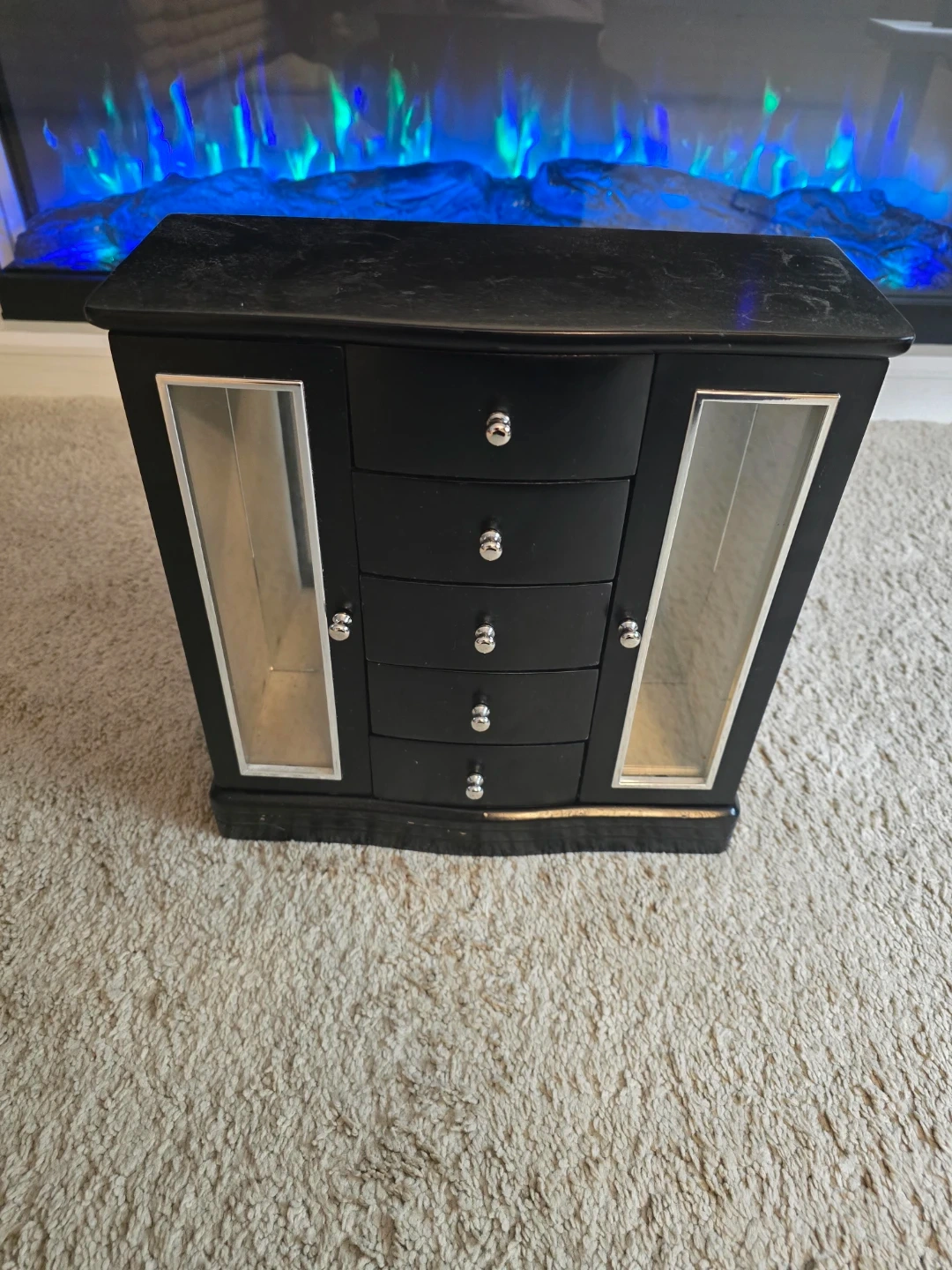 This black jewellery box features mirrored doors and multiple drawers for organized storage. It's designed to keep your accessories tidy and accessible. The compact size makes it a nice addition to any dresser or vanity.