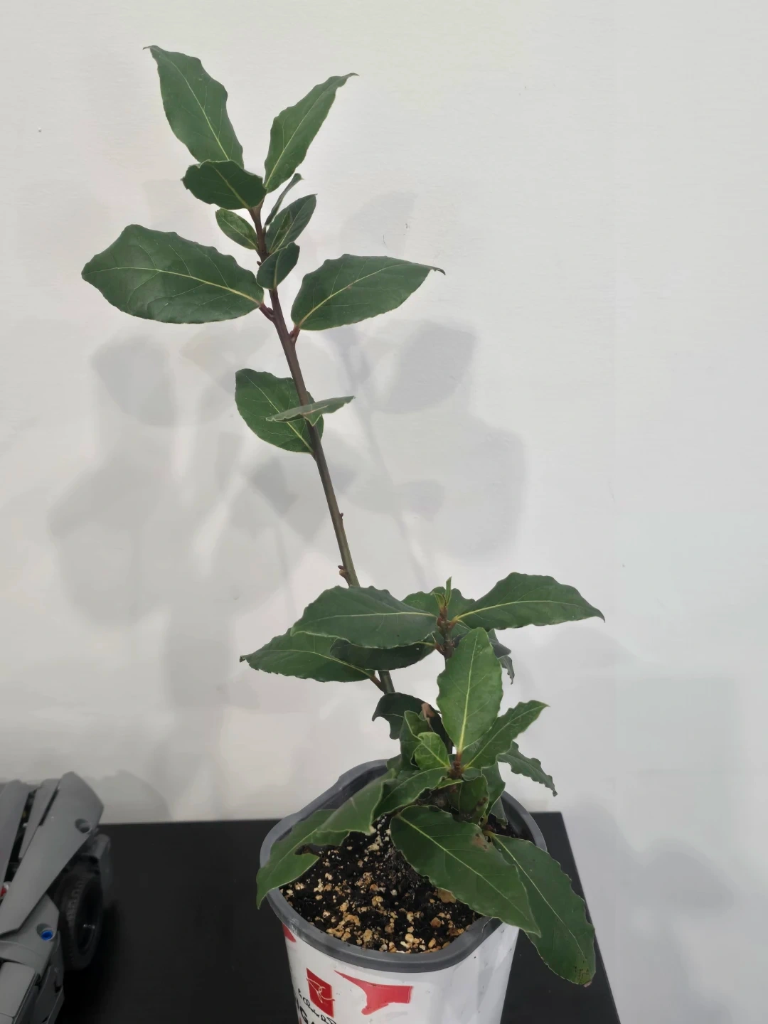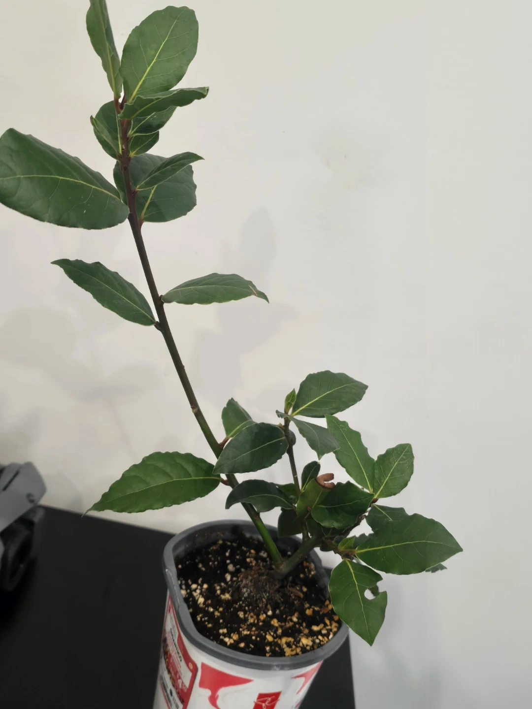 This is a bay laurel plant in a pot. It's great for growing your own culinary herbs. The plant has green leaves and a sturdy stem.