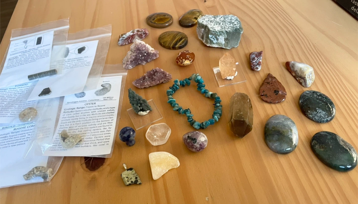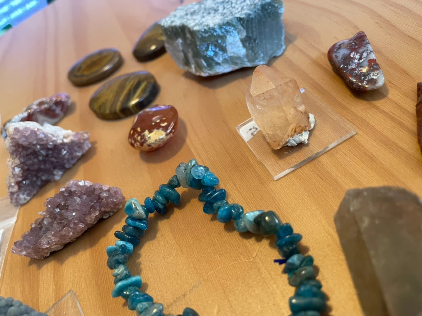 Some of the crystals: Smoky and tangerine quartz, Alacam amethyst, moss agate and tiger palms, sodalite mushroom, blue Tara quartz, and a grape agate specimen.