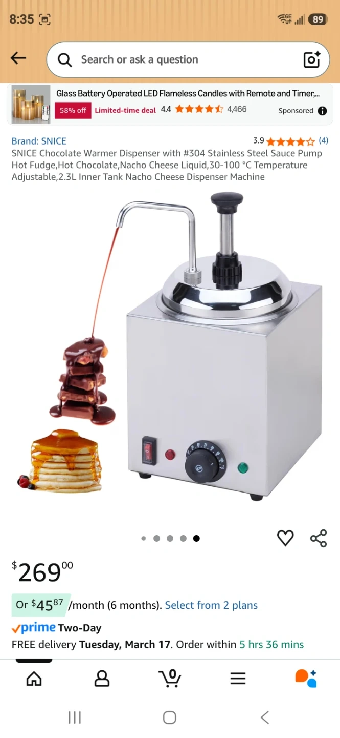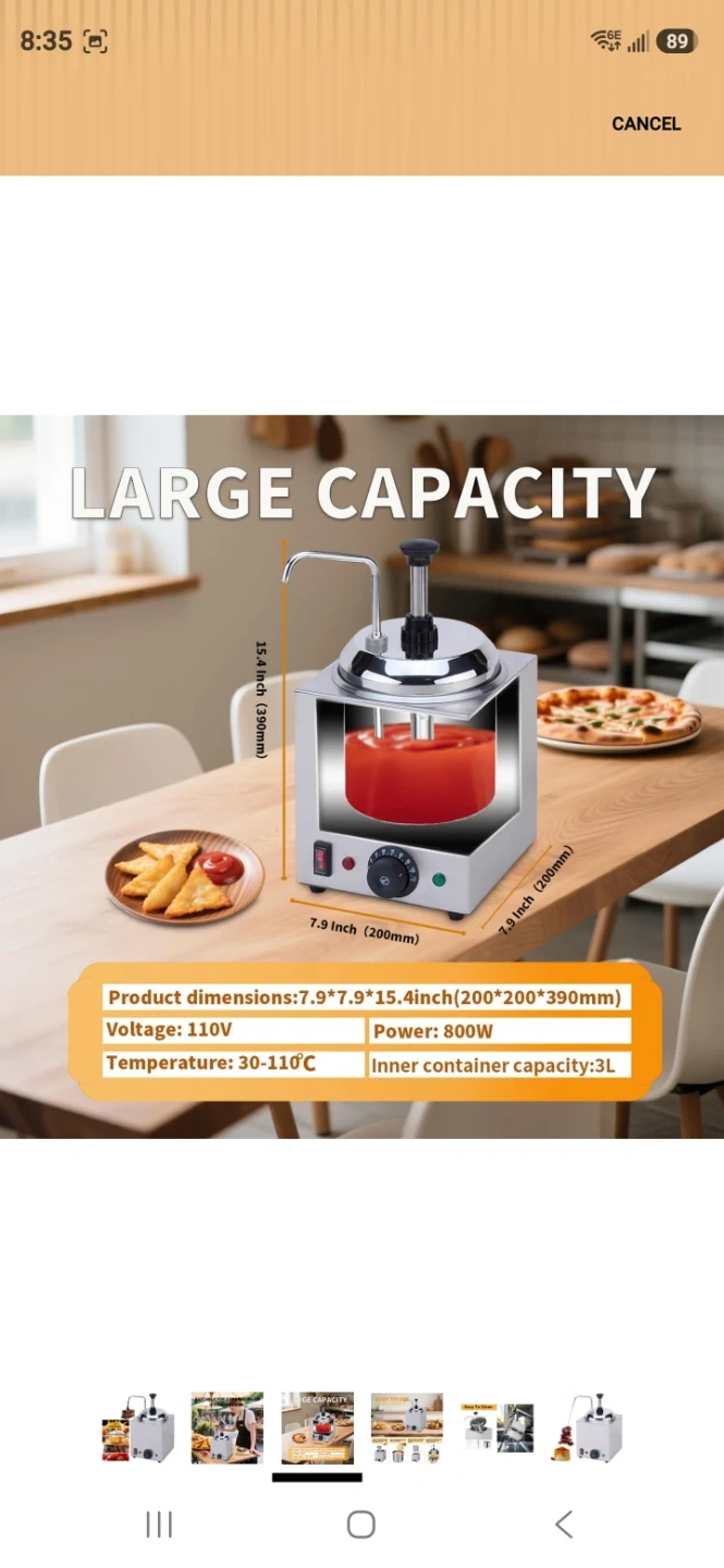 This SNICE sauce warmer dispenser has a 3L inner container capacity. It's made of stainless steel with a sauce pump. Temperature is adjustable from 30-110°C. It's great for keeping nacho cheese or hot fudge warm!