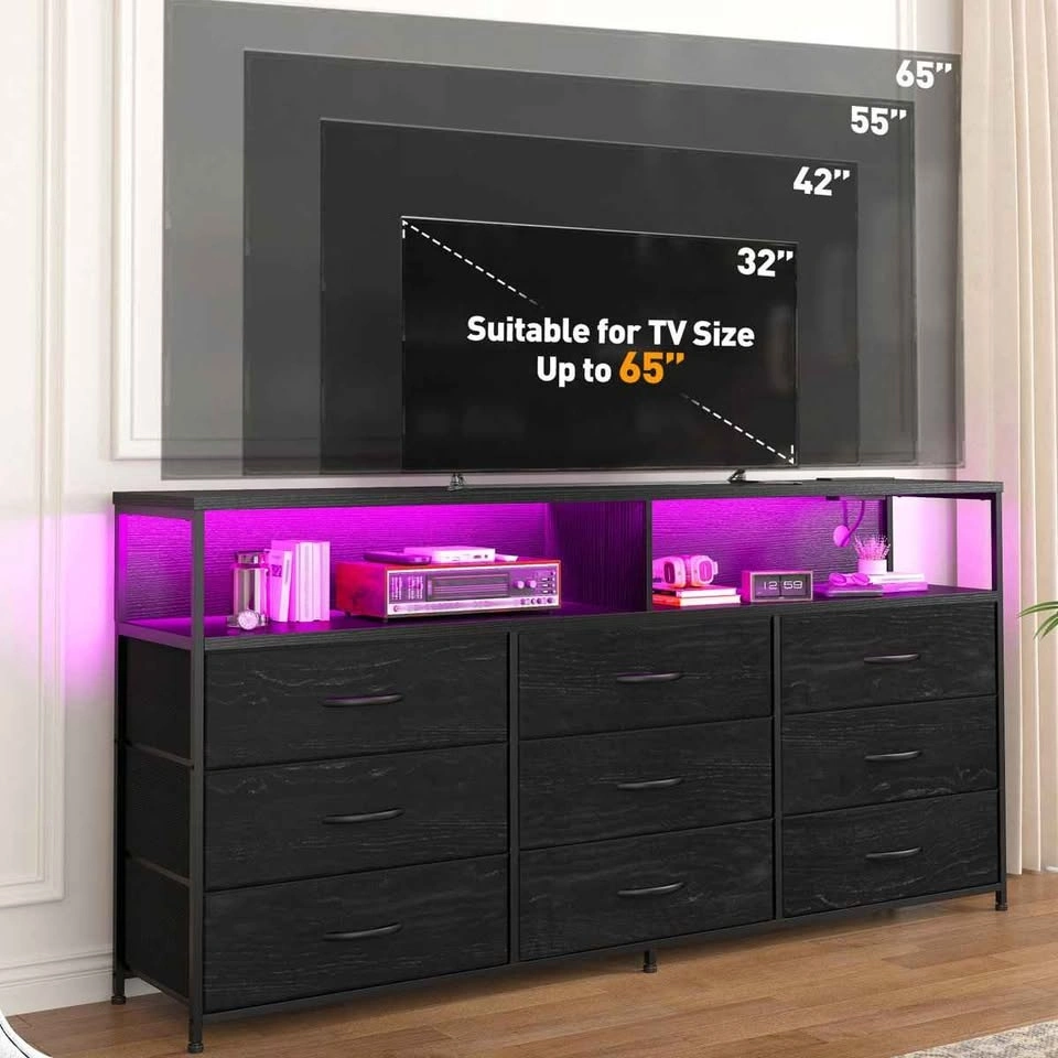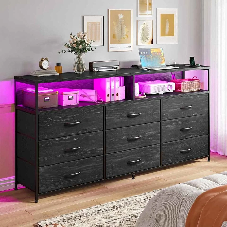 This is a modern dresser with a stylish and elegant appearance, suitable for any corner of your home or office. Measuring 55.12"W x 35.43"H x 11.81"D, it features nine deep, pull-out drawers and two-tiered open shelves that offer ample storage space. The spacious top surface also allows it to double as a TV stand. This dresser can even be combined with your wall-mounted television. The bedroom dresser includes LED lights and a charging station, creating a unique ambiance in your home, and recharging is incredibly easy. Number F72*
