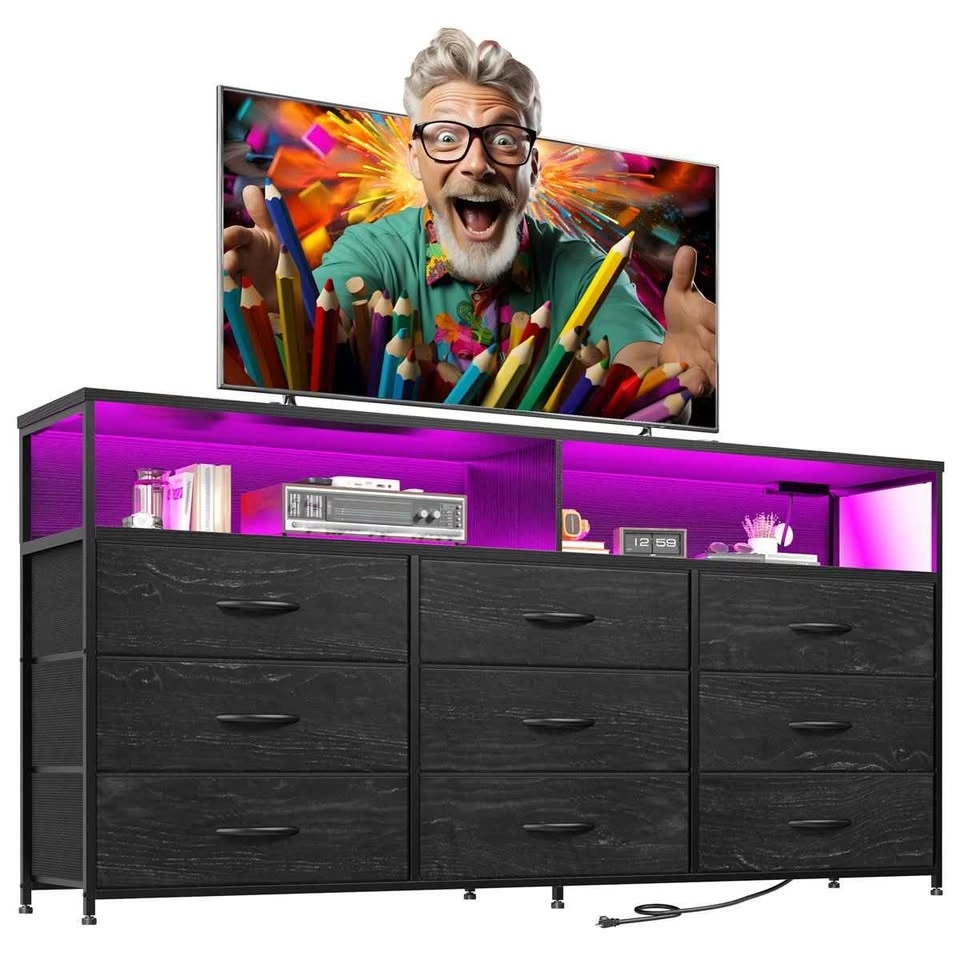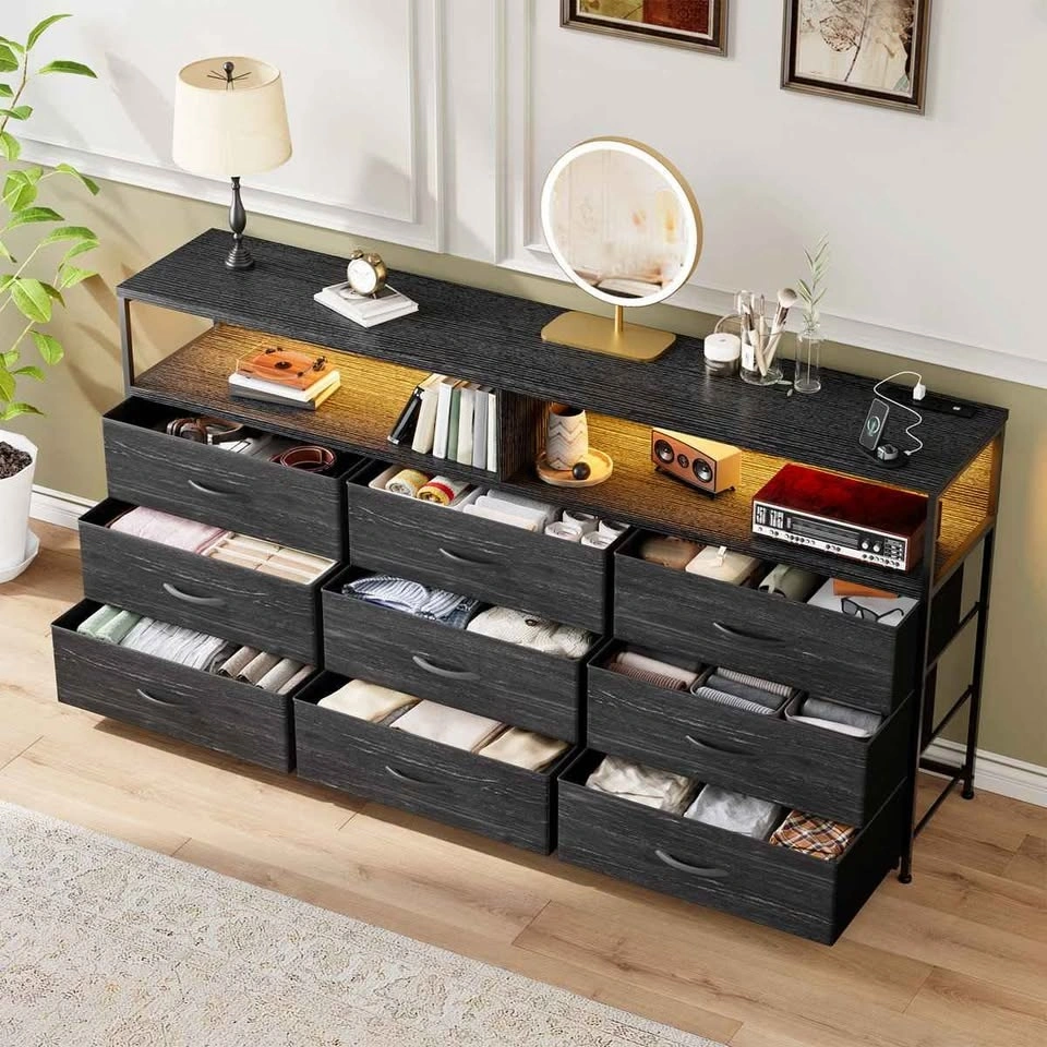 This is a modern dresser with a stylish and elegant appearance, suitable for any corner of your home or office. Measuring 55.12"W x 35.43"H x 11.81"D, it features nine deep, pull-out drawers and two-tiered open shelves that offer ample storage space. The spacious top surface also allows it to double as a TV stand. This dresser can even be combined with your wall-mounted television. The bedroom dresser includes LED lights and a charging station, creating a unique ambiance in your home, and recharging is incredibly easy. Number F72*