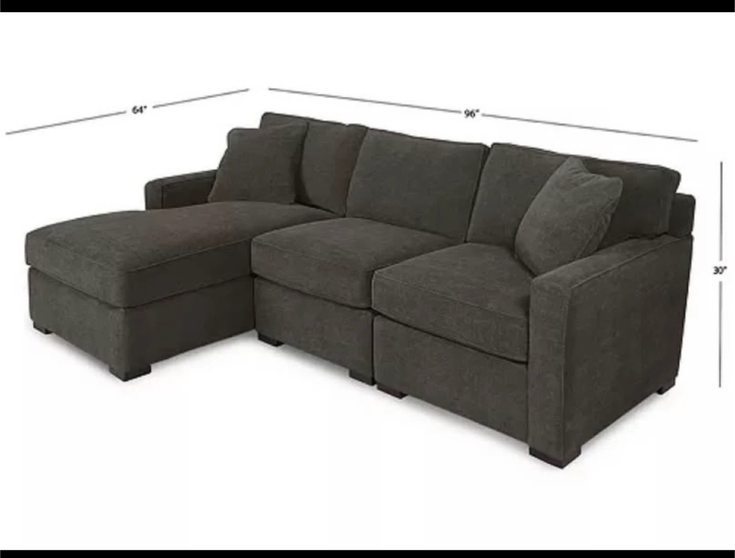 This comfortable sectional sofa is upholstered in a soft, gray fabric. It features a chaise lounge for extra relaxation. Dimensions: 96" W x 30" H. The chaise measures 64" deep.
