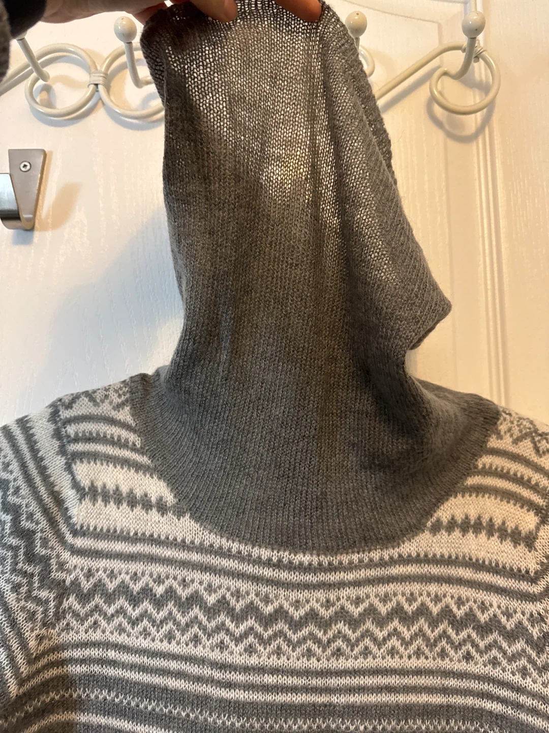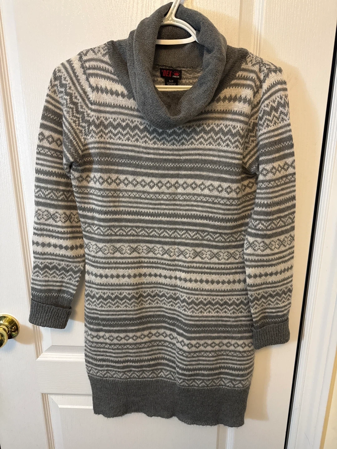 Grey and white fair isle pattern knit sweater dress with a cowl neck. Made of 47% acrylic, 44% nylon, and 9% spandex.