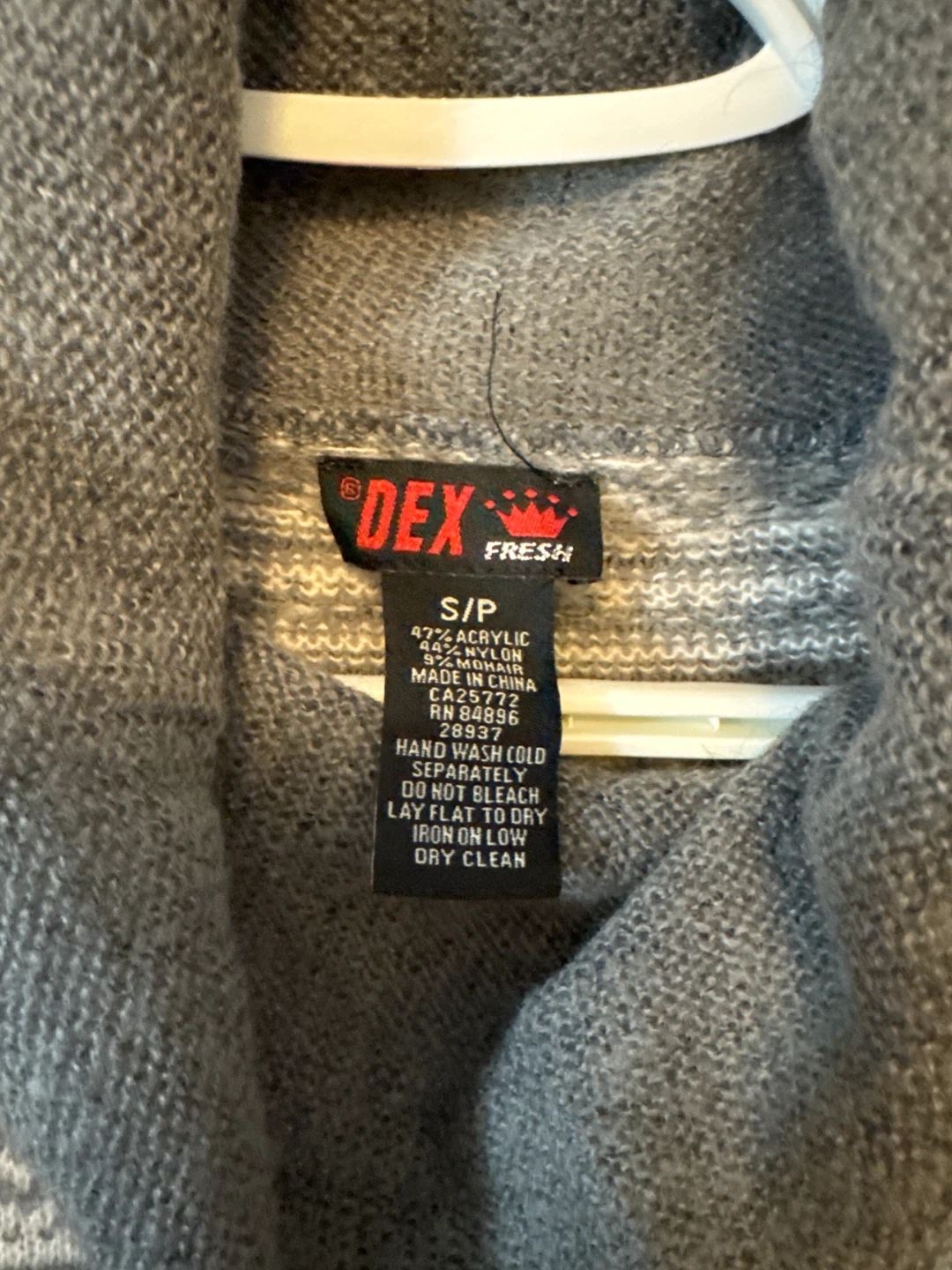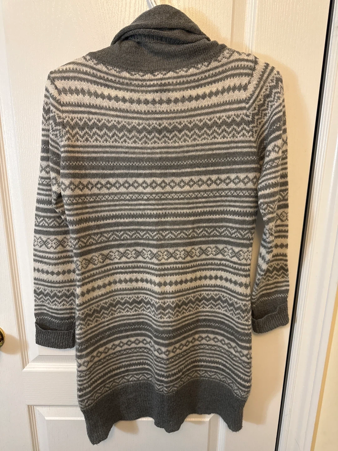 Grey and white fair isle pattern knit sweater dress with a cowl neck. Made of 47% acrylic, 44% nylon, and 9% spandex.