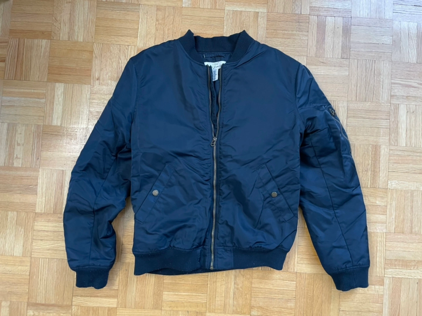 Here's a gently used navy blue bomber jacket from H&M! It's a size small and perfect for layering. It's in great condition and ready for a new home. Feel free to ask any questions!