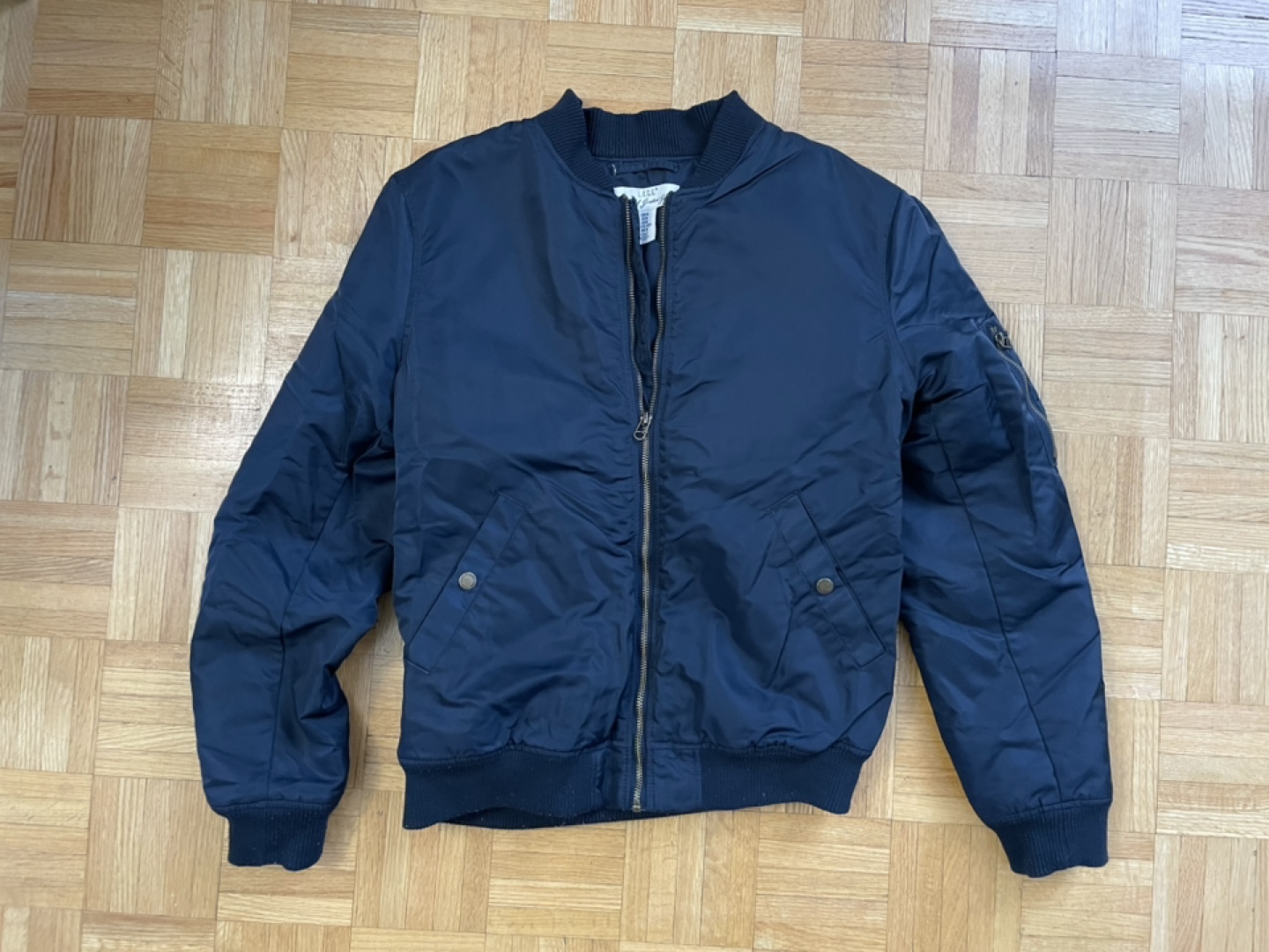 Here's a gently used navy blue bomber jacket from H&M! It's a size small and perfect for layering. It's in great condition and ready for a new home. Feel free to ask any questions!