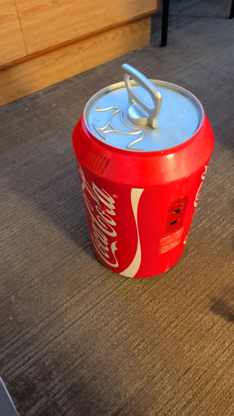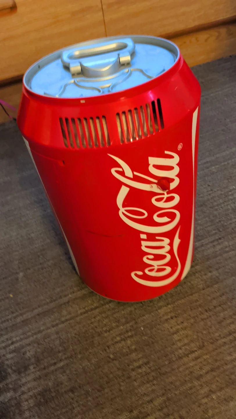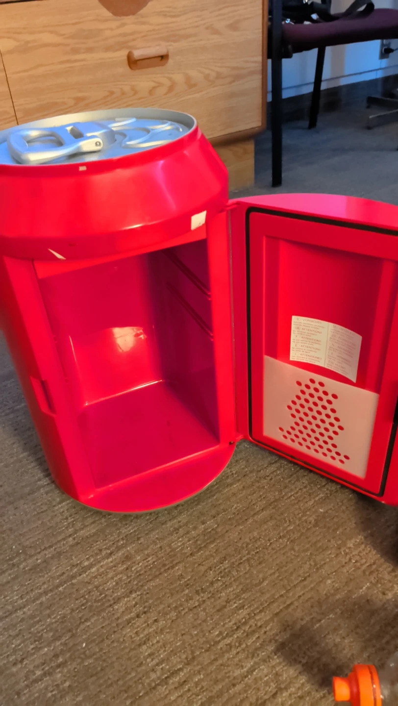 This is a Coca-Cola branded mini fridge, shaped like a giant soda can. It's red with the classic Coca-Cola logo. The door opens to reveal the interior space. Great for keeping drinks cool at your desk or in a rec room! Lost power cord