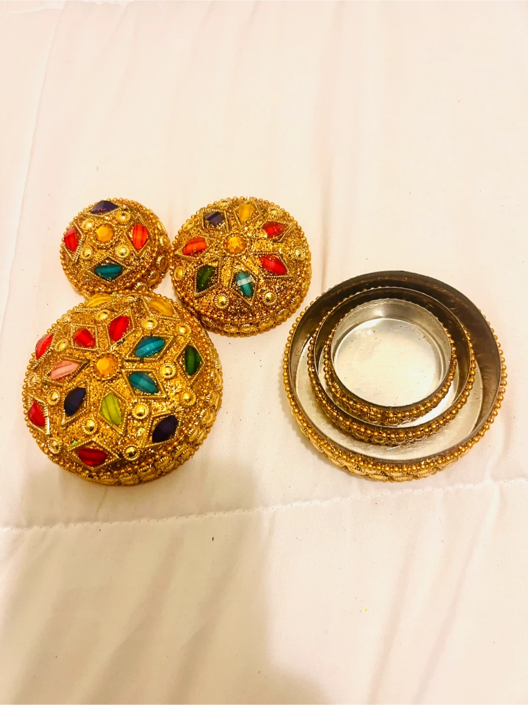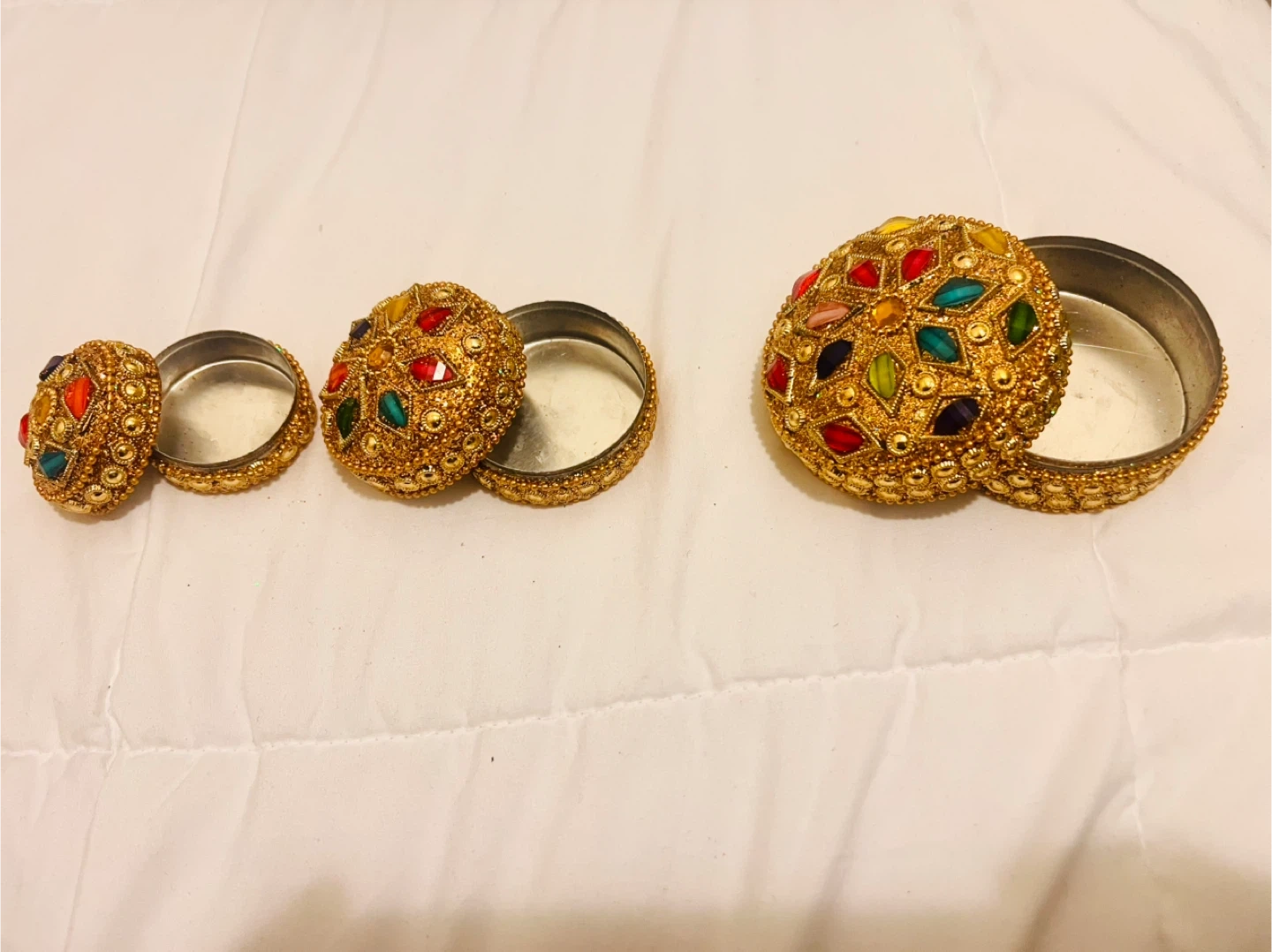 Three round, decorative trinket boxes with colourful jeweled tops. The boxes are gold-toned and intricately detailed. They come in three different sizes for storing small items. These decorative boxes can add a touch of elegance to any room!