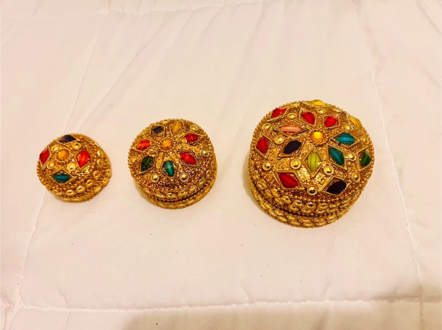 Three round, decorative trinket boxes with colourful jeweled tops. The boxes are gold-toned and intricately detailed. They come in three different sizes for storing small items. These decorative boxes can add a touch of elegance to any room!