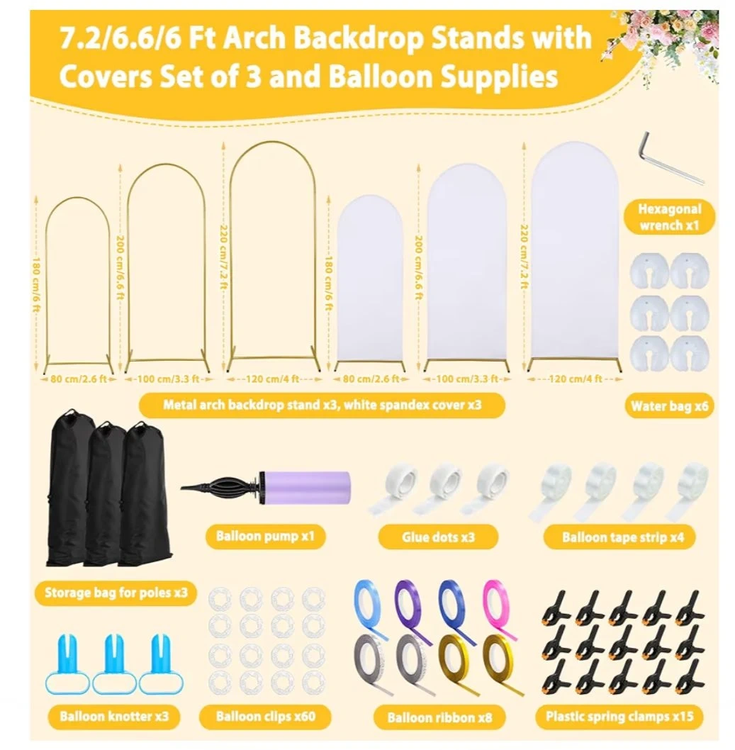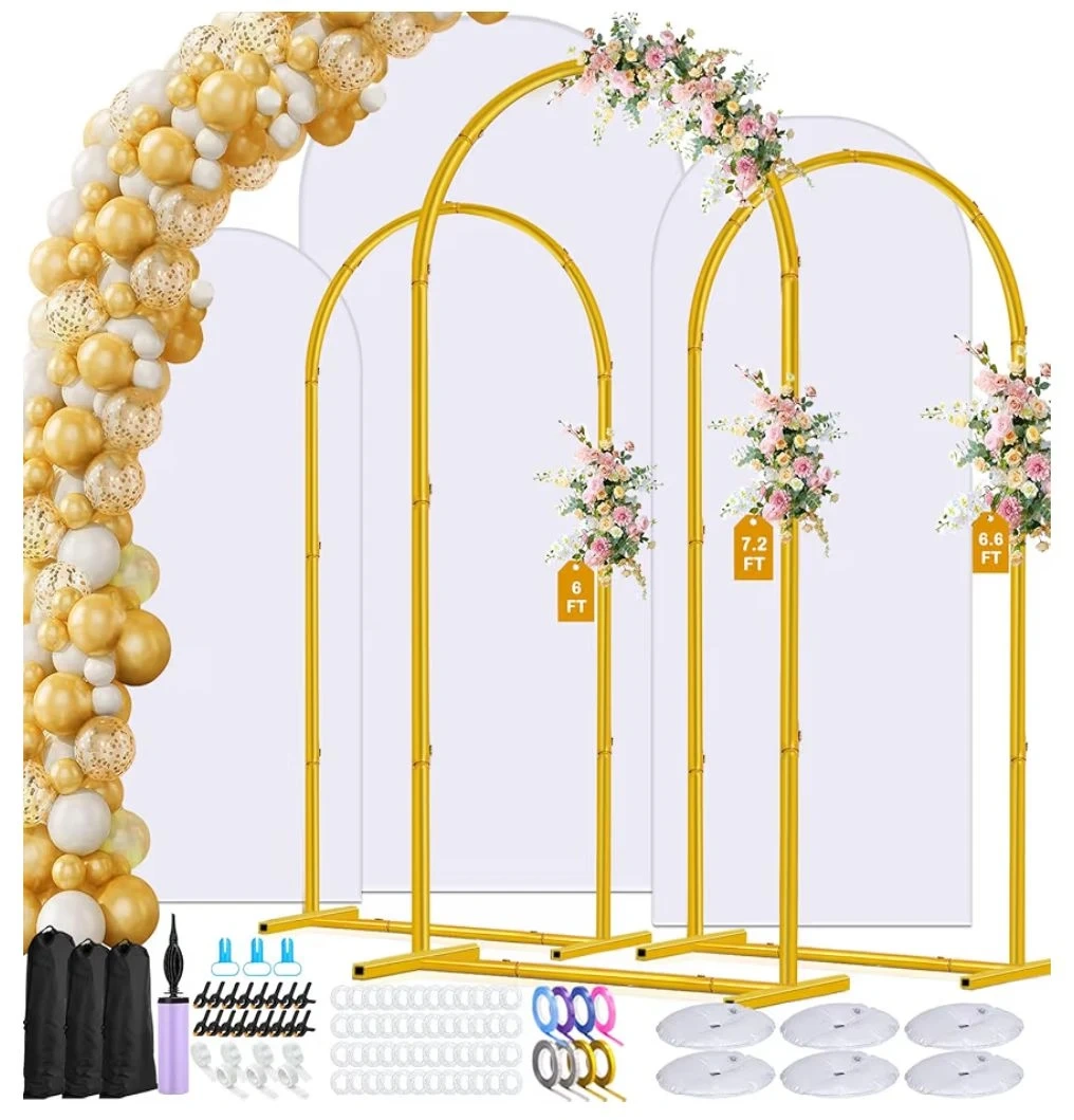 - 3 Metal Arches (Gold): Heights of 7.2ft, 6.6ft, and 6ft.