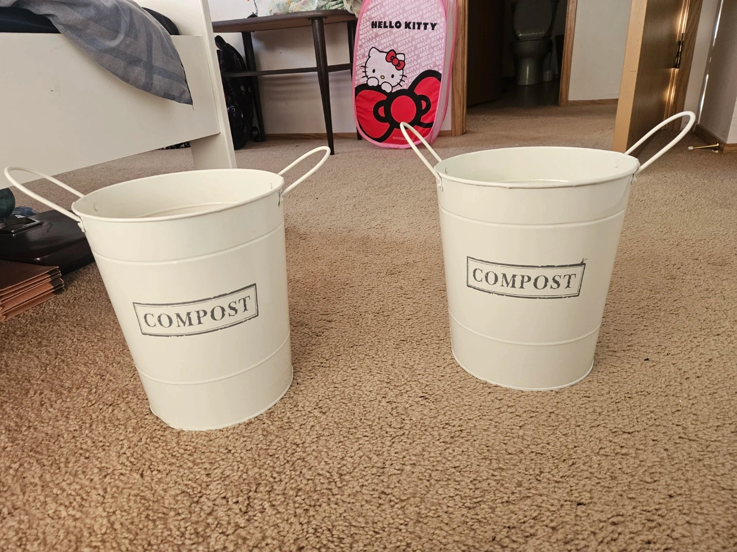 Two white metal compost bins with handles. Each bin is labelled 'COMPOST'. Perfect for kitchen scraps!
