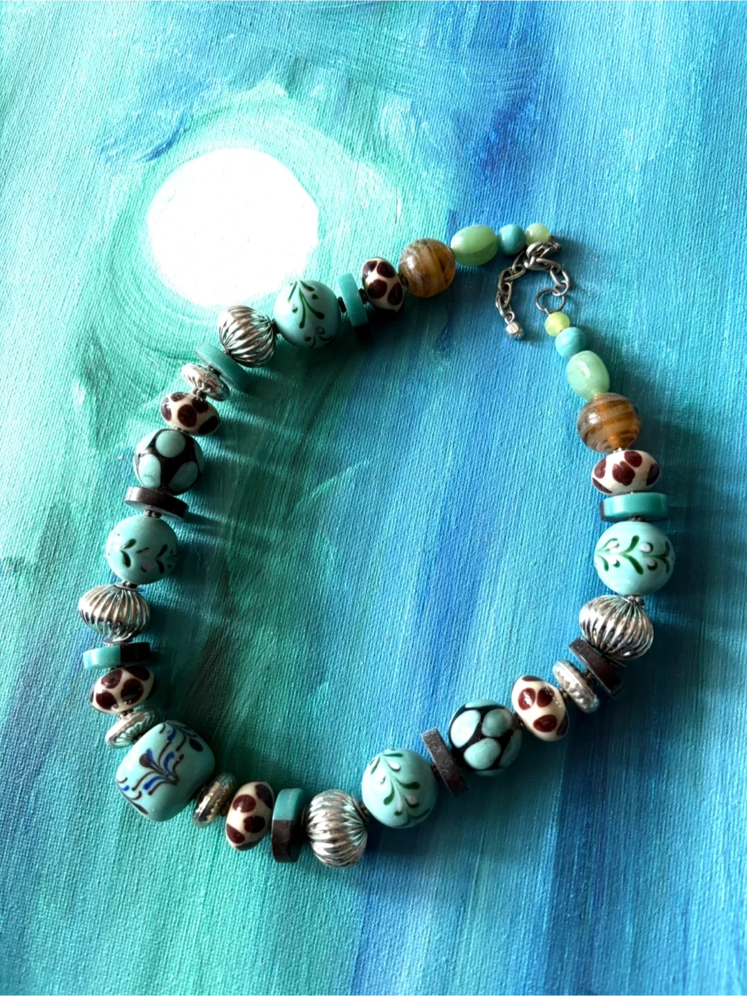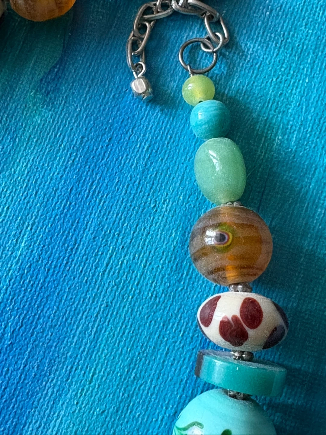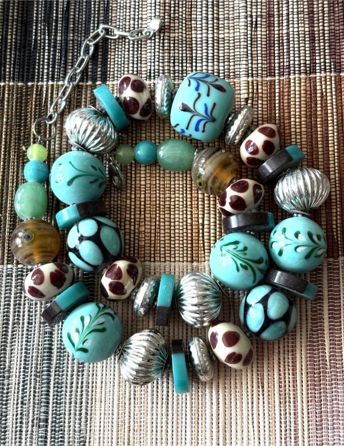 This necklace features a colorful assortment of beads including turquoise, amber, and patterned glass. It has a silver-tone clasp closure. It's a unique statement piece perfect for adding a pop of color to any outfit!