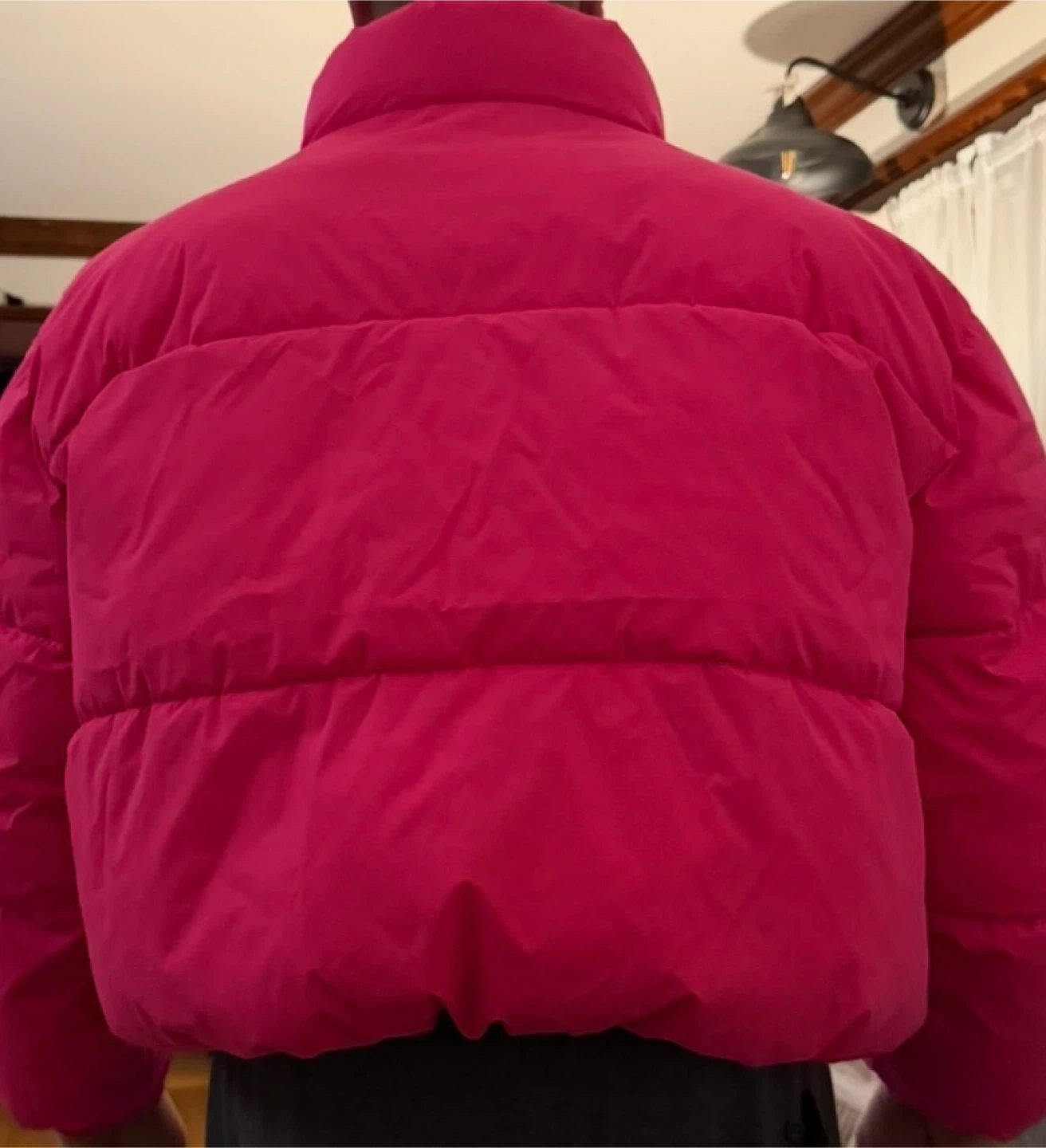 This is an Amazon Essentials cropped puffer jacket in neon pink. It's quilted and fully lined with a concealed front zipper and snap closure. The jacket features elastic cuffs and an adjustable bungee cord hem. Stand collar adds extra warmth.