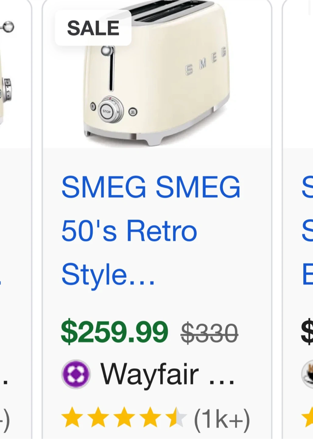50’s style retro SMEG wide slot, 2 slice toaster. It does have a few tiny dents and marks that are barely noticeable. It is cream colored. Cash only, price firm.